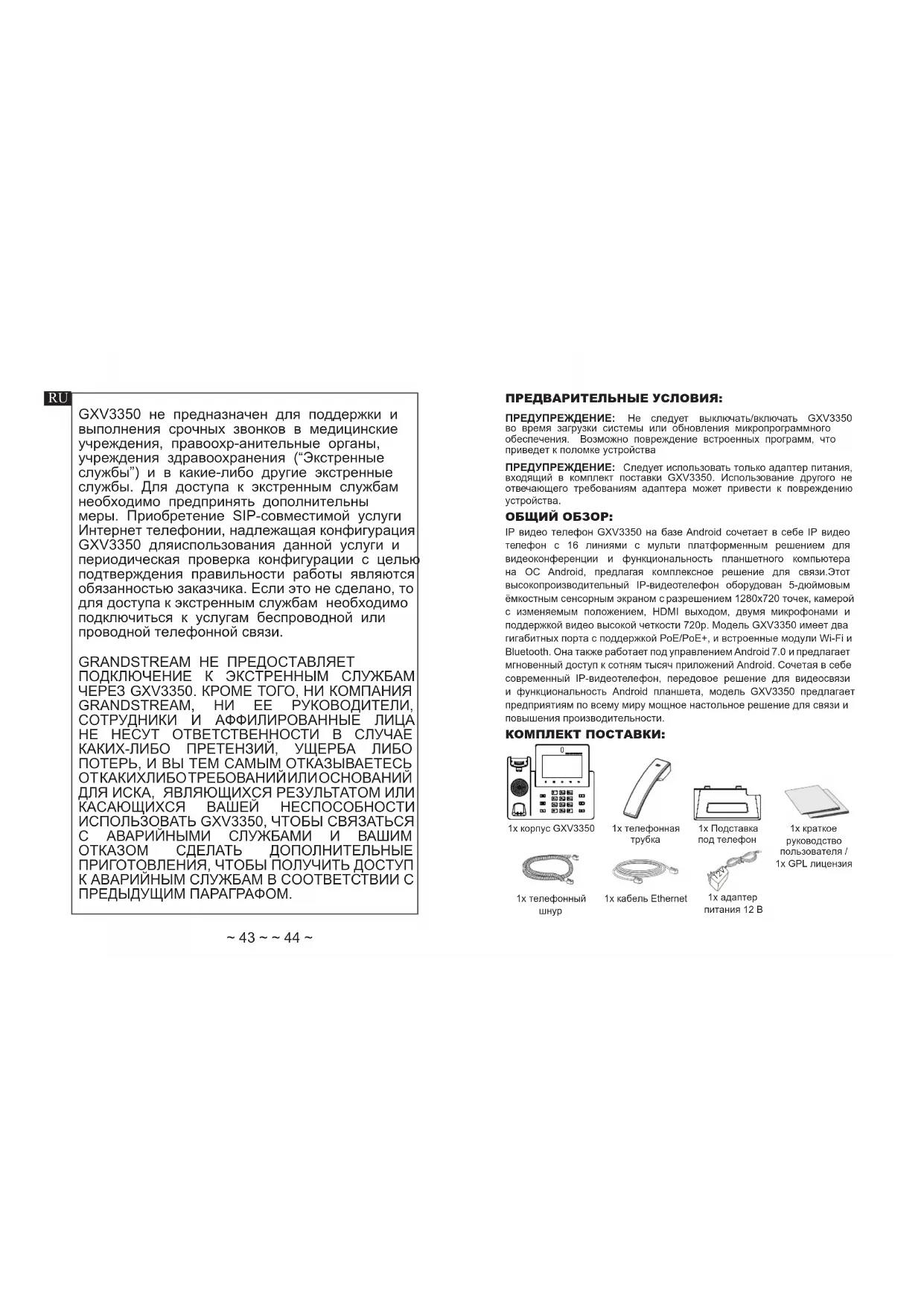 GXV3350 не предназначен для поддержки и выполнения срочных звонков в медицинские учреждения, правоохp-анительные органы, учреждения здравоохранения (“Экстренные службы”) и в какие-либо другие экстренные службы. Для доступа к экстренным службам необходимо предпринять дополнительны меры. Приобретение SIP-совместимой услуги Интернет телефонии, надлежащая конфигурация GXV3350 дляиспользования данной услуги и периодическая проверка конфигурации с целью подтверждения правильности работы являются обязанностью заказчика. Если это не сделано, то для доступа к экстренным службам необходимо подключиться к услугам беспроводной или проводной телефонной связи. GRANDSTREAM НЕ ПРЕДОСТАВЛЯЕТ ПОДКЛЮЧЕНИЕ К ЭКСТРЕННЫМ СЛУЖБАМ ЧЕРЕЗ GXV3350. КРОМЕ ТОГО, НИ КОМПАНИЯ GRANDSTREAM, НИ ЕЕ РУКОВОДИТЕЛИ, СОТРУДНИКИ И АФФИЛИРОВАННЫЕ ЛИЦА НЕ НЕСУТ ОТВЕТСТВЕННОСТИ В СЛУЧАЕ КАКИХ-ЛИБО ПРЕТЕНЗИЙ, УЩЕРБА ЛИБО ПОТЕРЬ, И ВЫ ТЕМ САМЫМ ОТКАЗЫВАЕТЕСЬ ОТ КАКИХЛИБО ТРЕБОВАНИЙ ИЛИ ОСНОВАНИЙ ДЛЯ ИСКА, ЯВЛЯЮЩИХСЯ РЕЗУЛЬТАТОМ ИЛИ КАСАЮЩИХСЯ ВАШЕЙ НЕСПОСОБНОСТИ ИСПОЛЬЗОВАТЬ GXV3350, ЧТОБЫ СВЯЗАТЬСЯ С АВАРИЙНЫМИ СЛУЖБАМИ И ВАШИМ ОТКАЗОМ СДЕЛАТЬ ДОПОЛНИТЕЛЬНЫЕ ПРИГОТОВЛЕНИЯ, ЧТОБЫ ПОЛУЧИТЬ ДОСТУП К АВАРИЙНЫМ СЛУЖБАМ В СООТВЕТСТВИИ С ПРЕДЫДУЩИМ ПАРАГРАФОМ. КОМПЛЕКТ ПОСТАВКИ: ПРЕДВАРИТЕЛЬНЫЕ УСЛОВИЯ: ПРЕДУПРЕЖДЕНИЕ: Не следует выключать/включать GXV3350 во время загрузки системы или обновления микропрограммного обеспечения. Возможно повреждение встроенных программ, что приведет к поломке устройства ПРЕДУПРЕЖДЕНИЕ: Следует использовать только адаптер питания, входящий в комплект поставки GXV3350. Использование другого не отвечающего требованиям адаптера может привести к повреждению устройства. 1x корпус GXV3350 1x телефонная