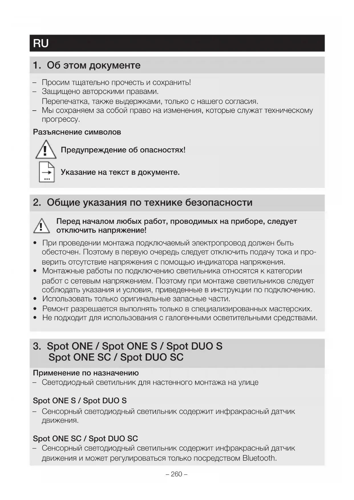 Зона регистрации: угол охвата Spot ONE/DUO S, ONE/DUO SC: 90° Зона регистрации: угол раствора Spot ONE/DUO S, ONE/DUO SC: 90° RU– 268 – Дальность действия обнаружения Spot ONE/DUO S, ONE/DUO SC: макс. 10 м Осветительное средство Светодиодное осветительное средство GU10 (макс. 9 Вт) Время включения Spot ONE/DUO S: 8сек. – 35 мин. Spot ONE/DUO SC: 5 сек. – 60мин. Установка сумеречного