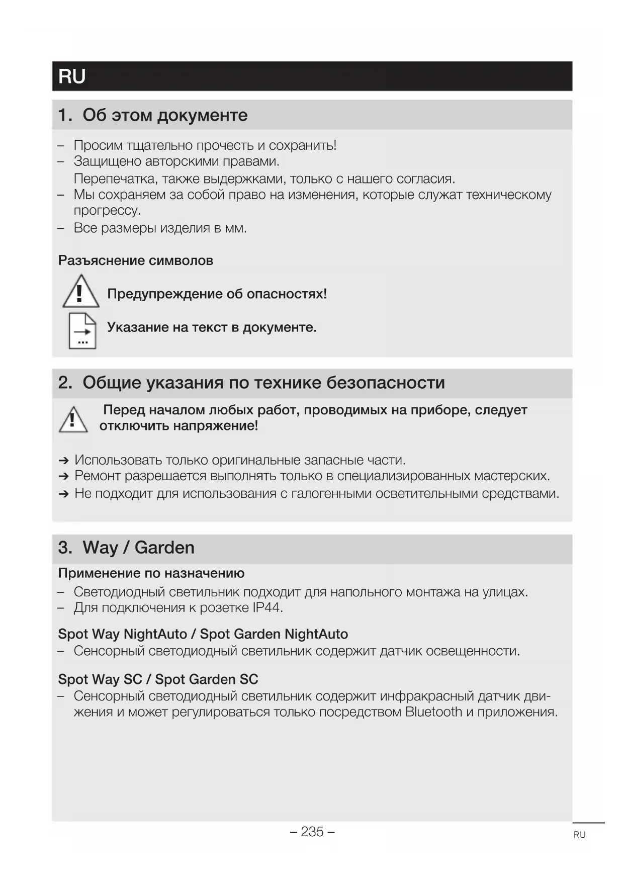 Применение по назначению – Светодиодный светильник подходит для напольного монтажа на улицах. – Для подключения к розетке IP44. Spot Way NightAuto/Spot Garden NightAuto – Сенсорный светодиодный светильник содержит датчик освещенности. Spot Way SC/Spot Garden SC – Сенсорный светодиодный светильник содержит инфракрасный датчик дви- жения и может регулироваться только посредством Bluetooth и приложения. RU– 236 – Применение не по назначению – Яркость светодиодного прожектора не регулируется.