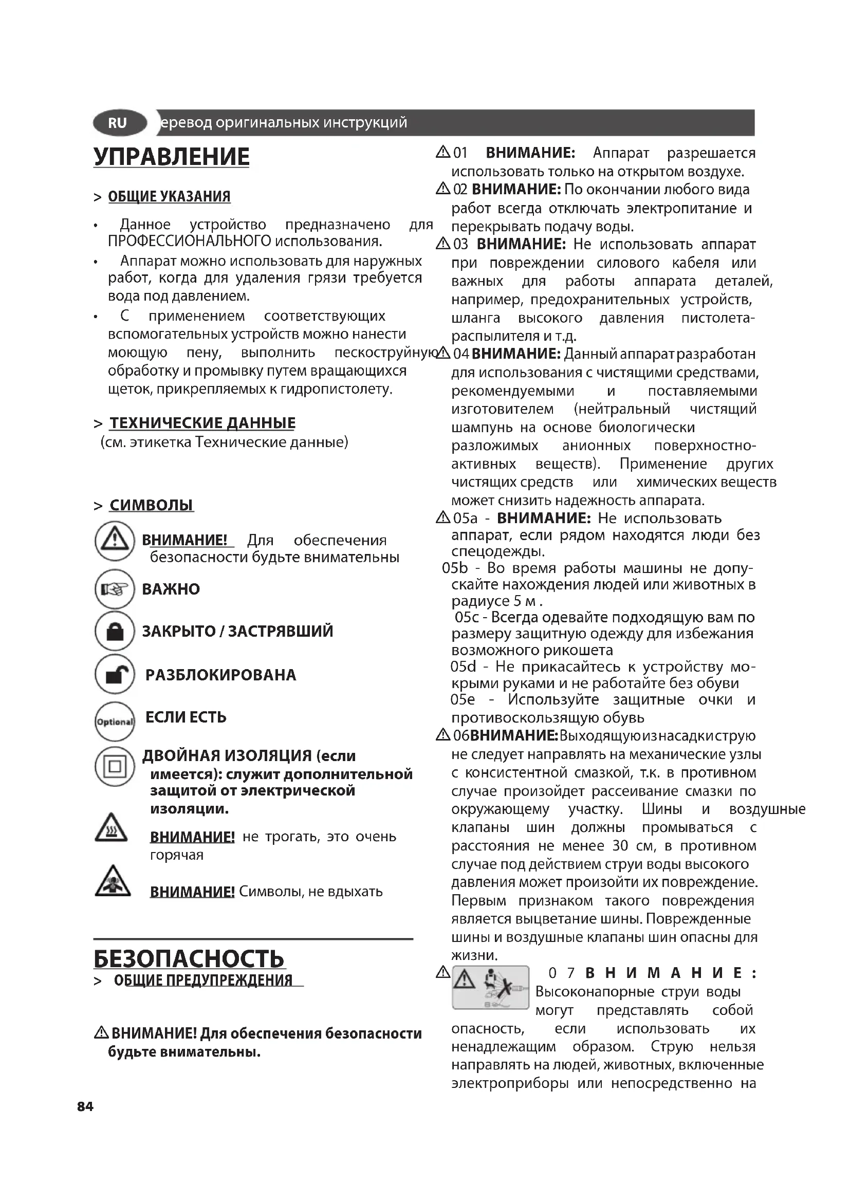 07ВНИМАНИЕ: Высоконапорные струи воды могут представлять собой опасность, если использовать их ненадлежащим образом. Струю нельзя направлятьналюдей,животных,включенные электроприборы или непосредственно на Перевод оригинальных инструкций