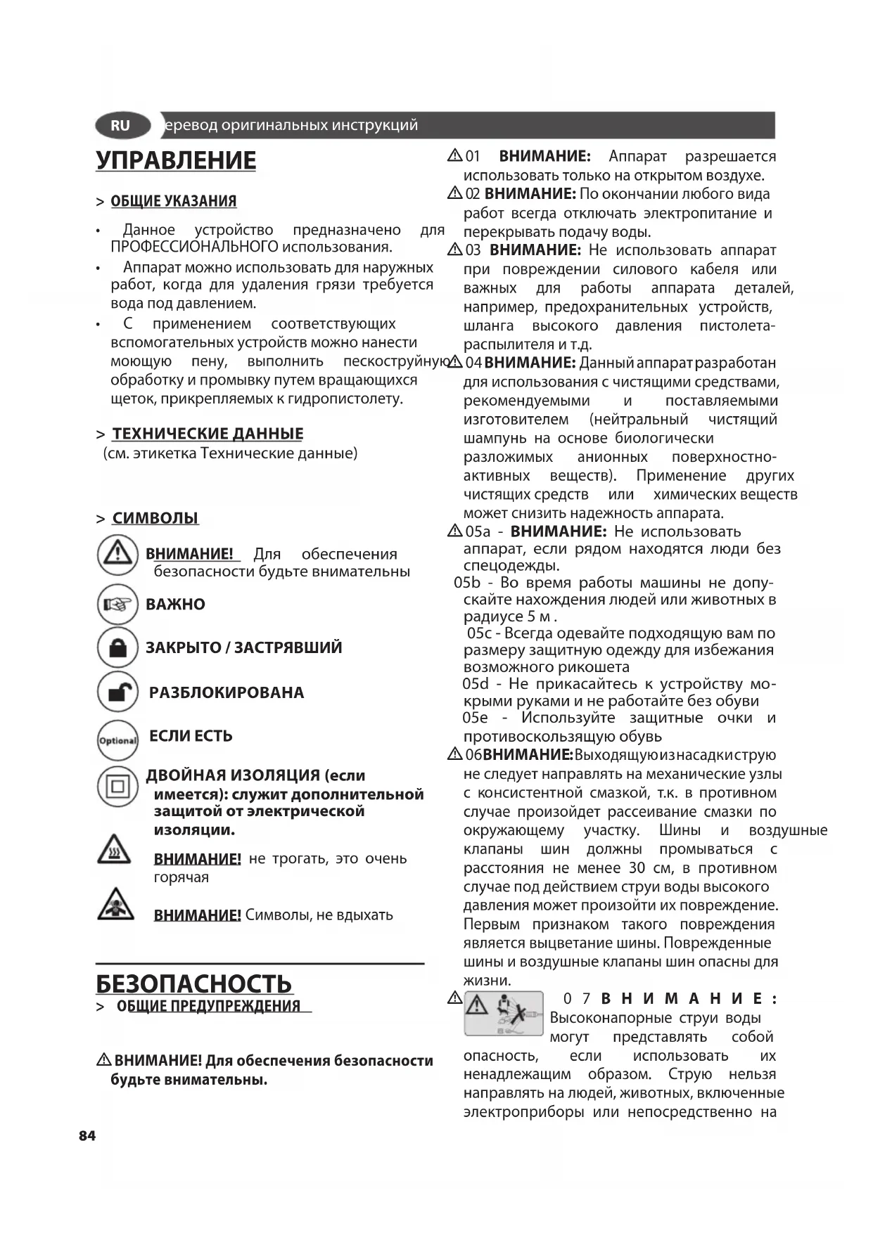 03 ВНИМАНИЕ: Не использовать аппарат при повреждении силового кабеля или важных для работы аппарата деталей, например, предохранительных устройств, шланга высокого давления пистолета- распылителя и т.д.