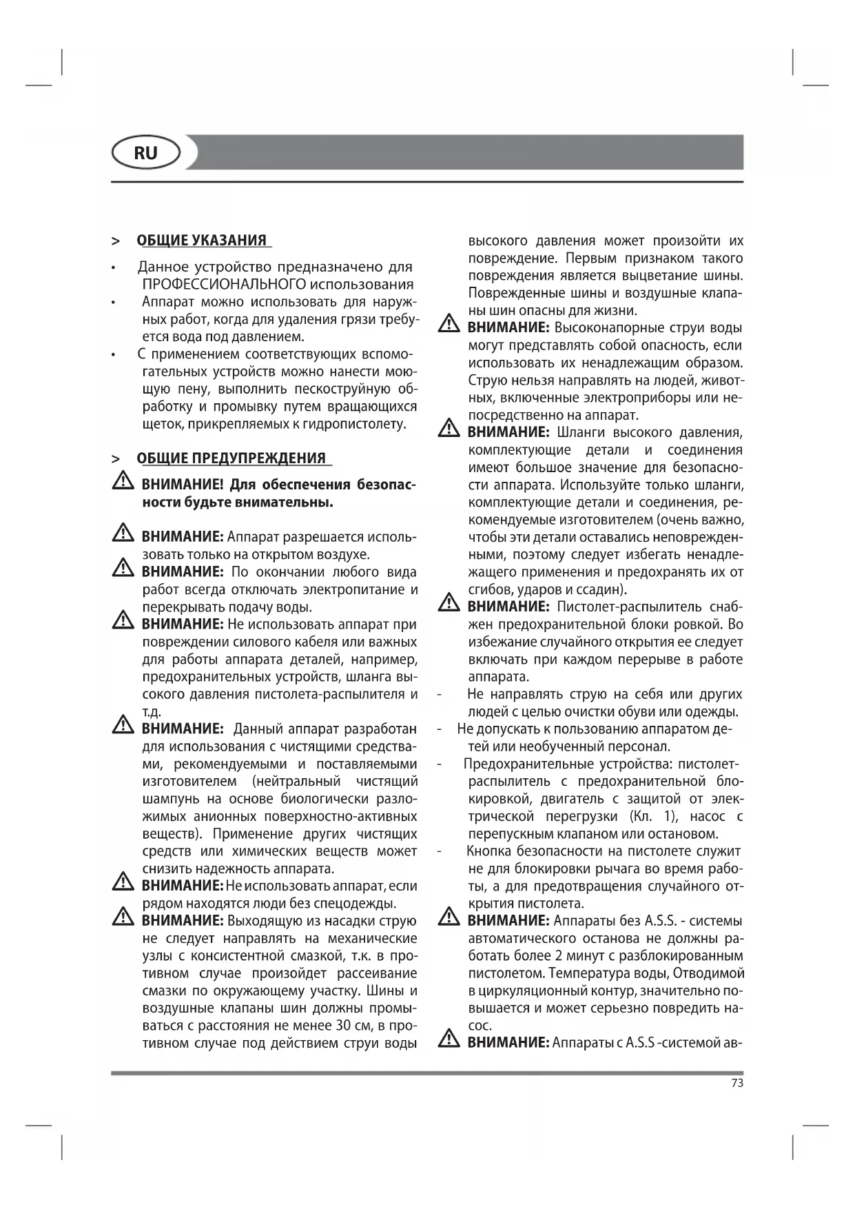 - С применением соответствующих вспомо- гательных устройств можно нанести мою- щую пену, выполнить пескоструйную об- работку и промывку путем вращающихся щеток, прикрепляемых к гидропистолету. > ОБЩИЕ ПРЕДУПРЕЖДЕНИЯ ВНИМАНИЕ! Для обеспечения безопас- ности будьте внимательны. ВНИМАНИЕ: Аппарат разрешается исполь- зовать только на открытом воздухе. ВНИМАНИЕ: По окончании любого вида работ всегда отключать электропитание и перекрывать подачу воды. ВНИМАНИЕ: Не использовать аппарат при повреждении силового кабеля или важных для работы аппарата деталей, например, предохранительных устройств, шланга вы- сокого давления пистолета-распылителя и