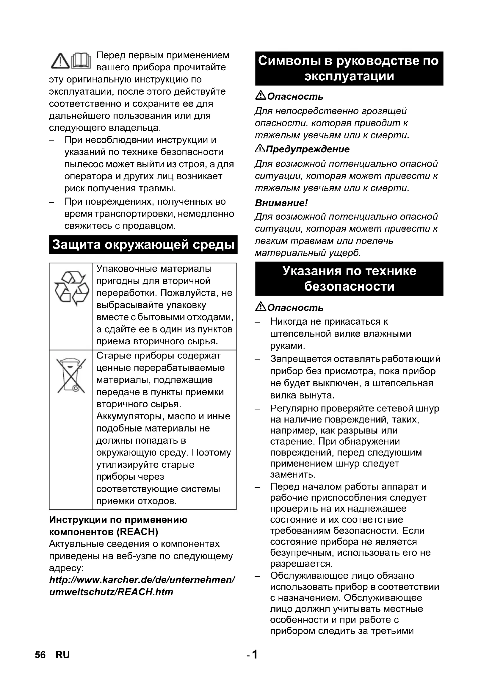 CEO Head of Approbation 55TR- 1 Перед первым применением вашего прибора прочитайте эту оригинальную инструкцию по эксплуатации, после этого действуйте соответственно и сохраните ее для дальнейшего пользования или для следующего владельца. – При несоблюдении инструкции и указаний по технике безопасности пылесос может выйти из строя, а для оператора и других лиц возникает риск получения травмы. – При повреждениях, полученных во время транспортировки, немедленно свяжитесь с продавцом. Инструкции по применению компонентов (REACH) Актуальные сведения о компонентах приведены на веб-узле по следующему