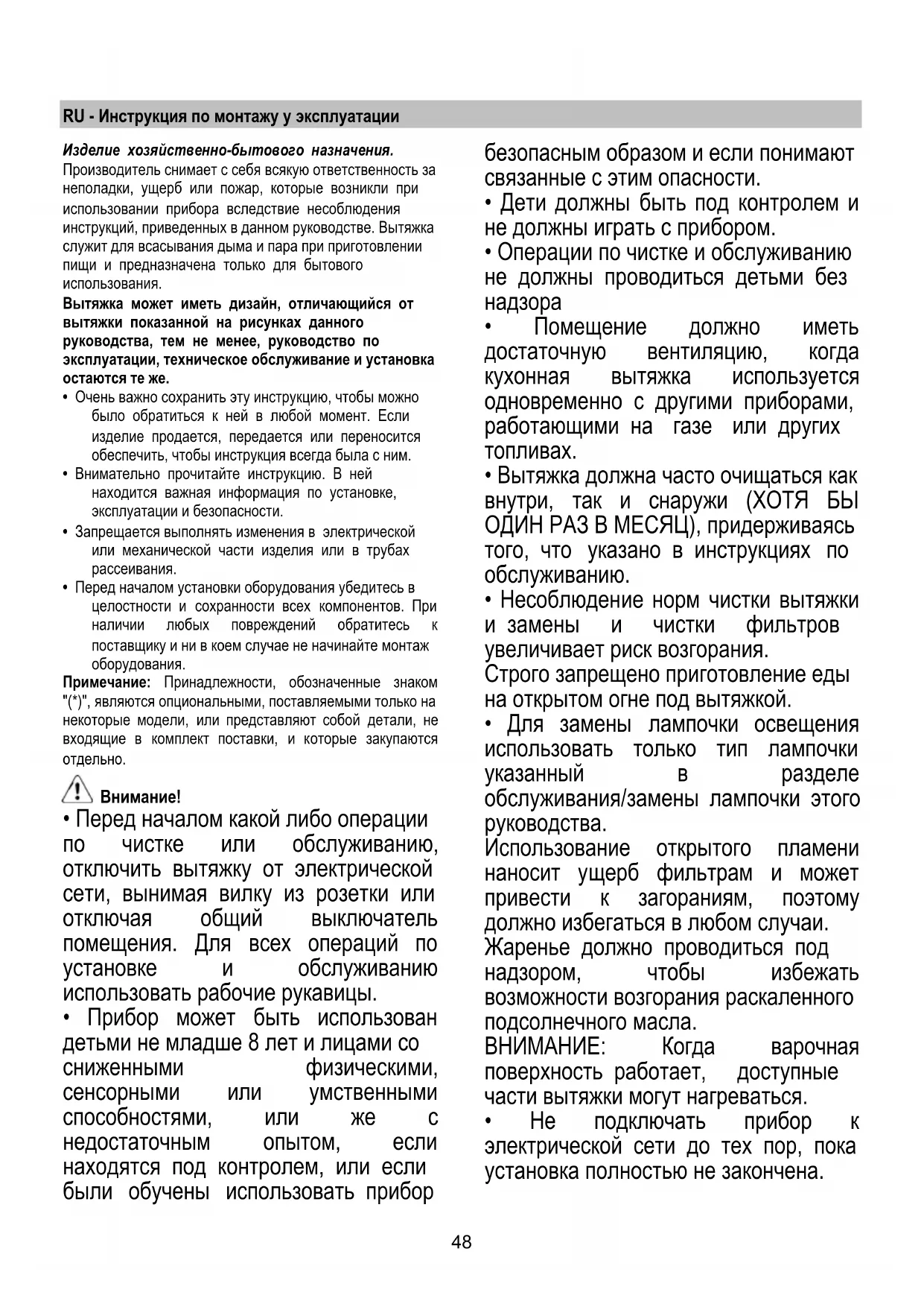 - Для замены лампочки освещения использовать только тип лампочки указанный в разделе обслуживания/замены лампочки этого руководства. Использование открытого пламени наносит ущерб фильтрам и может привести к загораниям, поэтому должно избегаться в любом случаи. Жаренье должно проводиться под надзором, чтобы избежать возможности возгорания раскаленного подсолнечного масла. ВНИМАНИЕ: Когда варочная поверхность работает, доступные части вытяжки могут нагреваться.