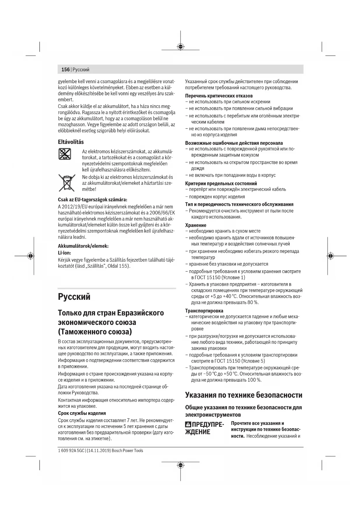 ТОО «Роберт Бош» (Robert Bosch) Power Tools послепродажное обслуживание ул. Муратбаева, д. 180 050012 Алматы, Казахстан Служебная эл. почта: service.pt.ka@bosch.com 1 609 92A 5GC | (14.11.2019) Bosch Power ToolsУкраїнська | 167 Официальный веб-сайт: www.bosch.com, www.bosch-pt.com В случае выхода электроинструмента из строя в течение гарантийного срока эксплуатации по вине изготовителя, владелец имеет право на бесплатный гарантийный ре- монт, при соблюдении следующих условий: – отсутствие механических повреждений; – отсутствие признаков нарушения требований руко- водства по эксплуатации – наличие в руководстве по эксплуатации отметки про- давца о продаже и подписи покупателя; – соответствие серийного номера электроинструмента и серийному номеру в гарантийном талоне; – отсутствие следов неквалифицированного ремонта. Гарантия не распространяется на: – любые поломки, связанные с форс-мажорными обсто- ятельствами; – нормальный износ: электроинструмента, так же, как и все электрические. Гарантией не покрывается ремонт, потребность в кото- ром возникает вследствие нормального износа, сокра- щающего срок службы таких частей инструмента, как присоединительные контакты, провода, щётки и т.п.: – естественный износ (полная выработка ресурса); – оборудование и его части, выход из строя которых стал следствием неправильной установки, несанкцио- нированной модификации, неправильного примене- ния, нарушение правил обслуживания или хранения; – неисправности, возникшие в результате перегрузки электроинструмента. (К безусловным признакам пере- грузки инструмента относятся: появление цвета побе- жалости, деформация или оплавление деталей и узлов электроинструмента, потемнение или обугливание изоляции проводов электродвигателя под действием высокой температуры.) Транспортировка На вложенные литиево-ионные аккумуляторные батареи распространяются требования в отношении транспорти- ровки опасных грузов. Аккумуляторные батареи могут перевозиться самим пользователем автомобильным транспортом без необходимости соблюдения дополни- тельных норм. При перевозке с привлечением третьих лиц (напр.: само- летом или транспортным экспедитором) необходимо соблюдать особые требования к упаковке и маркировке. В этом случае при подготовке груза к отправке необходи- мо участие эксперта по опасным грузам. Отправляйте аккумуляторную батарею только с неповре- жденным корпусом. Заклейте открытые контакты и упа- куйте аккумуляторную батарею так, чтобы она не переме- щалась внутри упаковки. Пожалуйста, соблюдайте также возможные дополнительные национальные предписа-