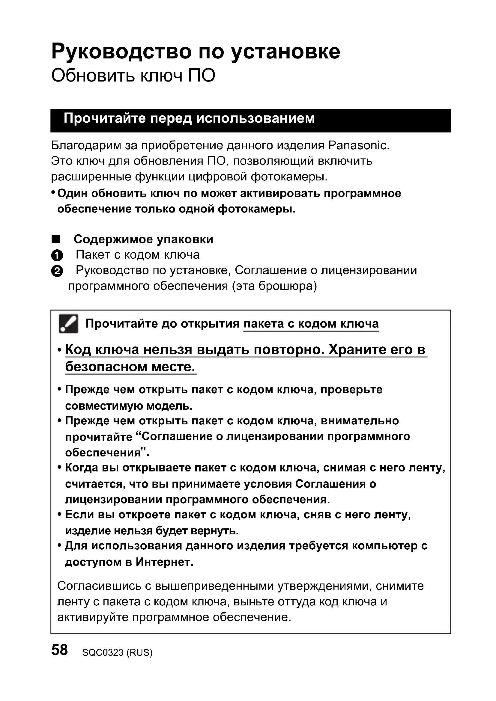 Один обновить ключ по может активировать программное обеспечение только одной фотокамеры. ∫ Содержимое упаковки 1 Пакет с кодом ключа 2 Руководство по установке, Соглашение о лицензировании программного обеспечения (эта брошюра) Прочитайте перед использованием Прочитайте до открытия пакета с кодом ключа