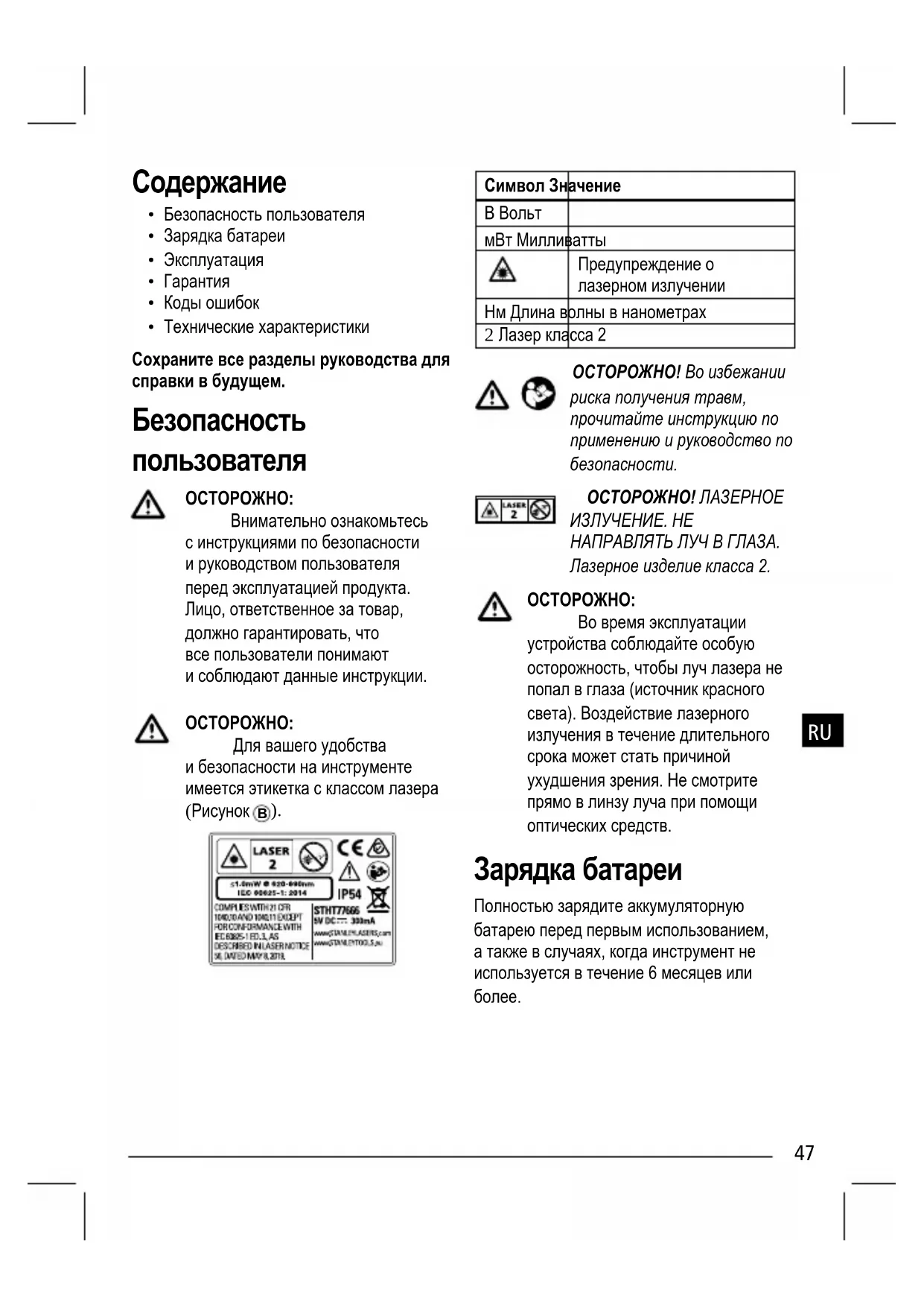 мВт Милливатты Предупреждение о лазерном излучении Нм Длина волны в нанометрах 2 Лазер класса 2 ОСТОРОЖНО! Во избежании риска получения травм, прочитайте инструкцию по применению и руководство по безопасности. ОСТОРОЖНО! ЛАЗЕРНОЕ ИЗЛУЧЕНИЕ. НЕ НАПРАВЛЯТЬ ЛУЧ В ГЛАЗА. Лазерное изделие класса 2.