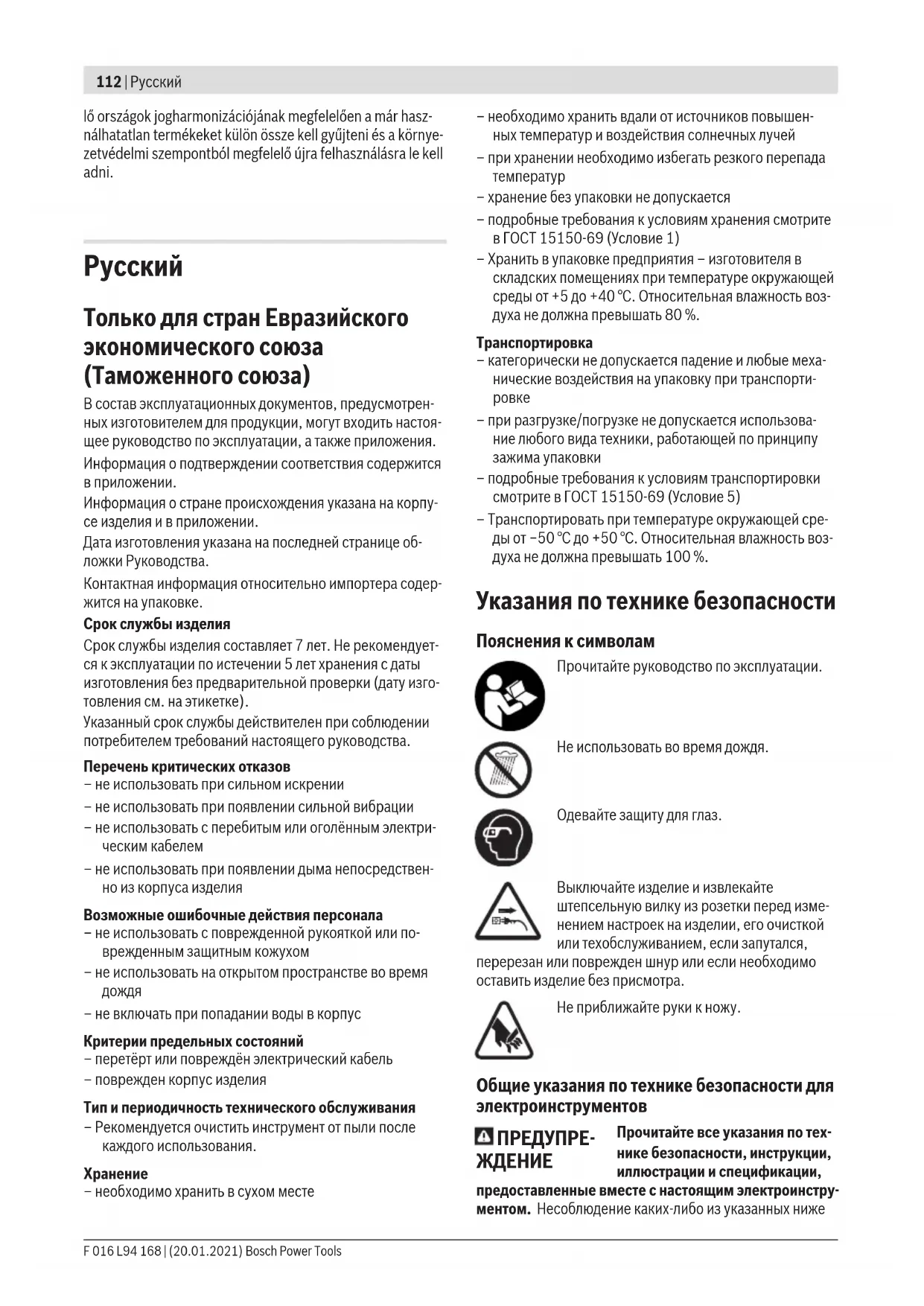 Прочитайте все указания по тех- нике безопасности, инструкции, иллюстрации и спецификации, предоставленные вместе с настоящим электроинстру- ментом. Несоблюдение каких-либо из указанных ниже F 016 L94 168 | (20.01.2021) Bosch Power ToolsРусский | 113 инструкций может стать причиной поражения электриче- ским током, пожара и/или тяжелых травм. Сохраняйте эти инструкции и указания для будущего использования. Использованное в настоящих инструкциях и указаниях понятие «электроинструмент» распространяется на элек- троинструмент с питанием от сети (с сетевым шнуром) и на аккумуляторный электроинструмент (без сетевого