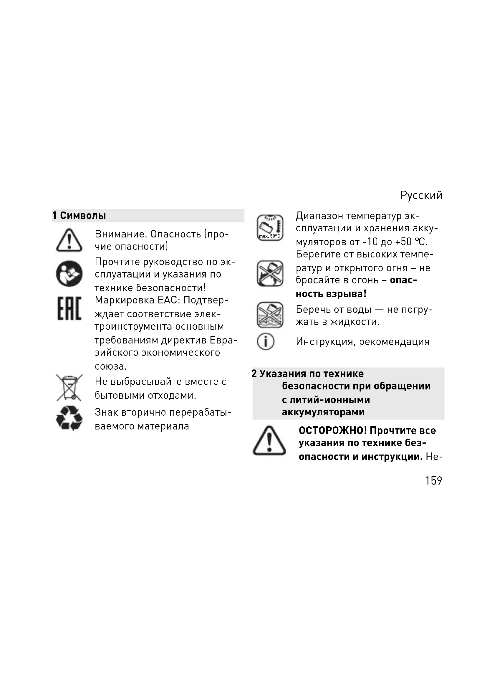 Берегите от высоких темпе ратур и открытого огня – не бросайте в огонь – опас ность взрыва! Беречь от воды — не погру жать в жидкости. Инструкция, рекомендация 2 Указания по технике безопасности при обращении с литий-ионными аккумуляторами ОСТОРОЖНО! Прочтите все указания по технике без опасности и инструкции. Не