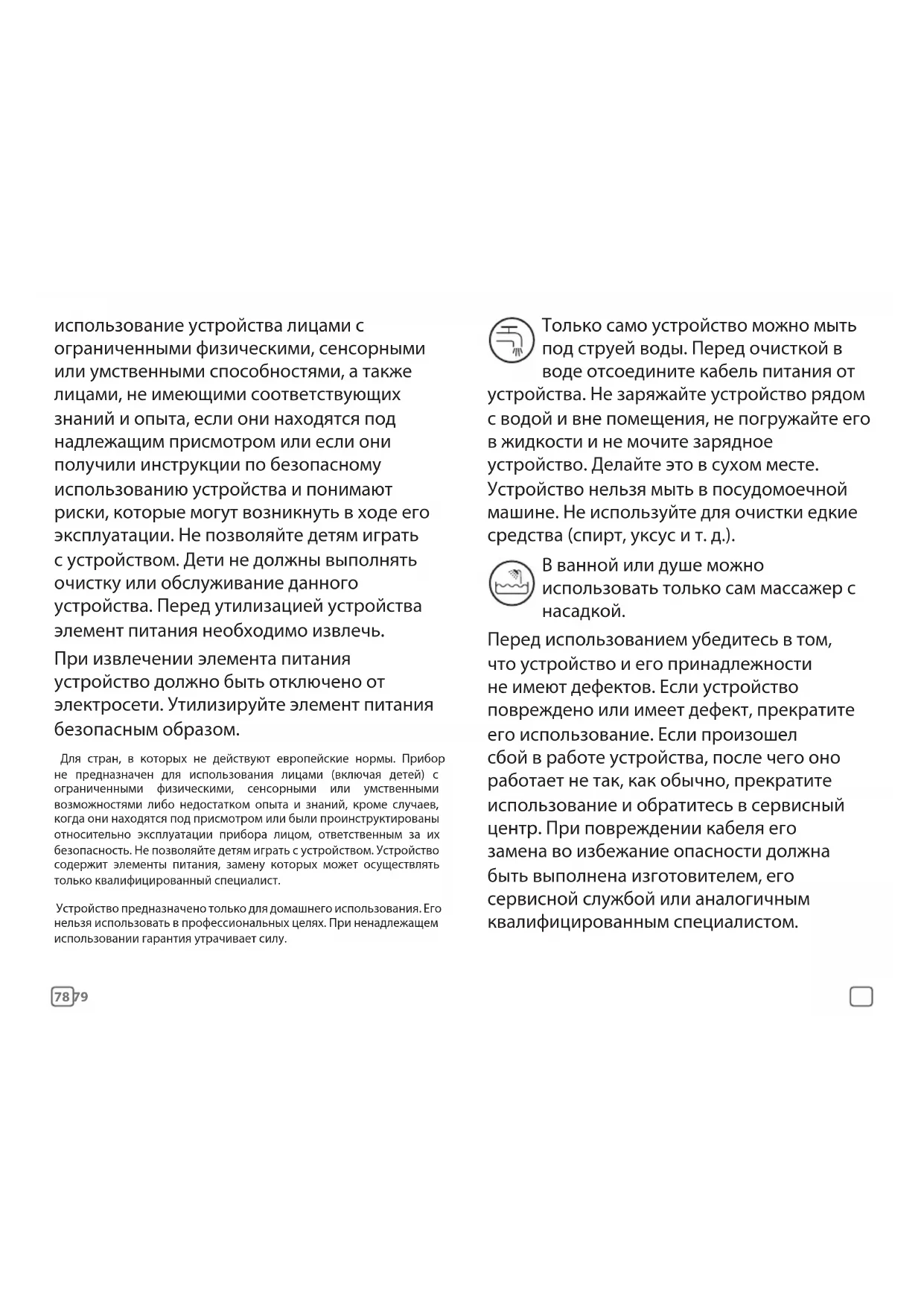использование устройства лицами с ограниченными физическими, сенсорными или умственными способностями, а также лицами, не имеющими соответствующих знаний и опыта, если они находятся под надлежащим присмотром или если они получили инструкции по безопасному использованию устройства и понимают риски, которые могут возникнуть в ходе его эксплуатации. Не позволяйте детям играть с устройством. Дети не должны выполнять очистку или обслуживание данного устройства. Перед утилизацией устройства элемент питания необходимо извлечь. При извлечении элемента питания устройство должно быть отключено от электросети. Утилизируйте элемент питания безопасным образом. Для стран, в которых не действуют европейские нормы. Прибор не предназначен для использования лицами (включая детей) с ограниченными физическими, сенсорными или умственными возможностями либо недостатком опыта и знаний, кроме случаев, когда они находятся под присмотром или были проинструктированы относительно эксплуатации прибора лицом, ответственным за их безопасность. Не позволяйте детям играть с устройством. Устройство содержит элементы питания, замену которых может осуществлять только квалифицированный специалист. Устройство предназначено только для домашнего использования. Его нельзя использовать в профессиональных целях. При ненадлежащем использовании гарантия утрачивает силу. Только само устройство можно мыть под струей воды. Перед очисткой в воде отсоедините кабель питания от устройства. Не заряжайте устройство рядом с водой и вне помещения, не погружайте его в жидкости и не мочите зарядное устройство. Делайте это в сухом месте. Устройство нельзя мыть в посудомоечной машине. Не используйте для очистки едкие средства (спирт, уксус и т.д.). В ванной или душе можно использовать только сам массажер с