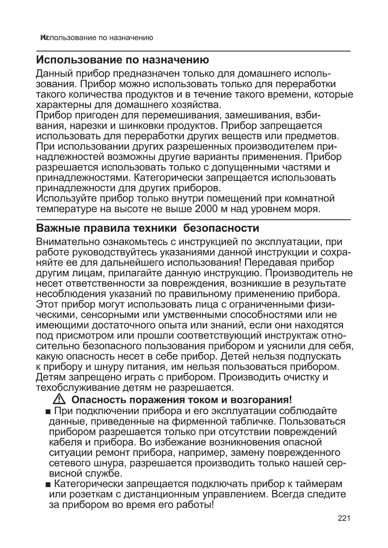 Использование по назначению Использование по назначению Данный прибор предназначен только для домашнего исполь- зования. Прибор можно использовать только для переработки такого количества продуктов и в течение такого времени, которые характерны для домашнего хозяйства. Прибор пригоден для перемешивания, замешивания, взби- вания, нарезки и шинковки продуктов. Прибор запрещается использовать для переработки других веществ или предметов. При использовании других разрешенных производителем при- надлежностей возможны другие варианты применения. Прибор разрешается использовать только с допущенными частями и принадлежностями. Категорически запрещается использовать принадлежности для других приборов. Используйте прибор только внутри помещений при комнатной температуре на высоте не выше 2000 м над уровнем моря. Важные правила техники безопасности Внимательно ознакомьтесь с инструкцией по эксплуатации, при работе руководствуйтесь указаниями данной инструкции и сохра- няйте ее для дальнейшего использования! Передавая прибор другим лицам, прилагайте данную инструкцию. Производитель не несет ответственности за повреждения, возникшие в результате несоблюдения указаний по правильному применению прибора. Этот прибор могут использовать лица с ограниченными физи- ческими, сенсорными или умственными способностями или не имеющими достаточного опыта или знаний, если они находятся под присмотром или прошли соответствующий инструктаж отно- сительно безопасного пользования прибором и уяснили для себя, какую опасность несет в себе прибор. Детей нельзя подпускать к прибору и шнуру питания, им нельзя пользоваться прибором. Детям запрещено играть с прибором. Производить очистку и техобслуживание детям не разрешается. W Опасность поражения током и возгорания! ■ При подключении прибора и его эксплуатации соблюдайте данные, приведенные на фирменной табличке. Пользоваться прибором разрешается только при отсутствии повреждений кабеля и прибора. Во избежание возникновения опасной ситуации ремонт прибора, например, замену поврежденного сетевого шнура, разрешается производить только нашей сер- висной службе. ■ Категорически запрещается подключать прибор к таймерам или розеткам с дистанционным управлением. Всегда следите за прибором во время его работы!222 ru Важные правила техники безопасности ■ Ни в коем случае не ставьте прибор на горячие поверхности, например, на электроплиту, или вблизи них. Сетевой кабель не должен соприкасаться с горячими частями или проходить через острые грани. ■ Ни в коем случае не погружайте основной блок в воду и не мойте его в посудомоечной машине. Не используйте паровые очистители. Не используйте прибор влажными руками. ■ После каждого применения, при отсутствии присмотра, перед сборкой, разборкой или очисткой, а также в случае неисправ- ности обязательно отсоедините прибор от сети. ■ При перебоях электроснабжения прибор остается включенным и после возобновления электроснабжения снова начинает