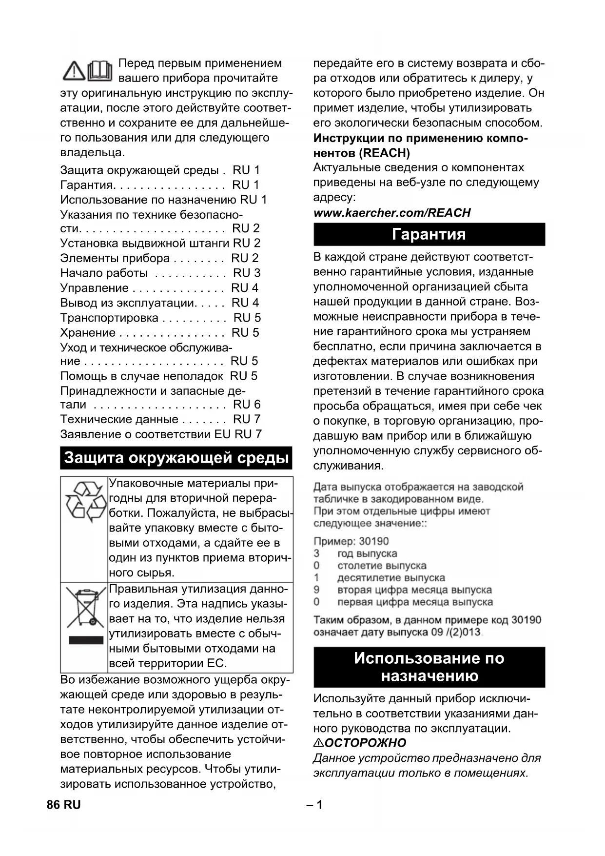 www.kaercher.com/REACH В каждой стране действуют соответст- венно гарантийные условия, изданные уполномоченной организацией сбыта нашей продукции в данной стране. Воз- можные неисправности прибора в тече- ние гарантийного срока мы устраняем бесплатно, если причина заключается в дефектах материалов или ошибках при изготовлении. В случае возникновения претензий в течение гарантийного срока просьба обращаться, имея при себе чек о покупке, в торговую организацию, про- давшую вам прибор или в ближайшую уполномоченную службу сервисного об- служивания. Используйте данный прибор исключи- тельно в соответствии указаниями дан- ного руководства по эксплуатации. 몇 ОСТОРОЖНО Данное устройство предназначено для эксплуатации только в помещениях. Защита окружающей среды . RU 1 Гарантия. . . . . . . . . . . . . . . . . RU 1 Использование по назначению RU 1 Указания по технике безопасно- сти. . . . . . . . . . . . . . . . . . . . . . RU 2 Установка выдвижной штанги RU 2 Элементы прибора . . . . . . . . RU 2 Начало работы . . . . . . . . . . . RU 3 Управление . . . . . . . . . . . . . . RU 4 Вывод из эксплуатации. . . . . RU 4 Транспортировка . . . . . . . . . . RU 5 Хранение . . . . . . . . . . . . . . . . RU 5 Уход и техническое обслужива- ние . . . . . . . . . . . . . . . . . . . . . RU 5 Помощь в случае неполадок RU 5 Принадлежности и запасные де- тали . . . . . . . . . . . . . . . . . . . . RU 6 Технические данные . . . . . . . RU 7 Заявление о соответствии ЕU RU 7 Защита окружающей среды Упаковочные материалы при- годны для вторичной перера- ботки. Пожалуйста, не выбрасы- вайте упаковку вместе с быто- выми отходами, а сдайте ее в один из пунктов приема вторич- ного сырья. Правильная утилизация данно- го изделия. Эта надпись указы- вает на то, что изделие нельзя утилизировать вместе с обыч- ными бытовыми отходами на всей территории ЕС.