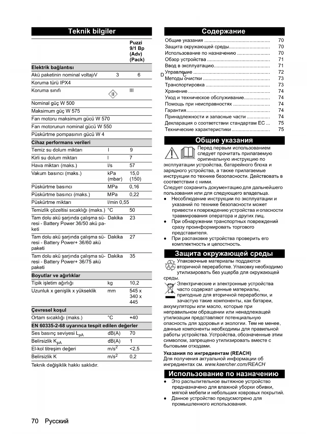 Battery Power+ 36/60 (АU) 2.445-051.0 6.445-069.0 Puzzi 9/1 Bp (Adv) (Pack) Электрическое подключение Номинальное напряжение аккумуляторного блока V36 DC Степень защиты IPX4 Класс защиты III Номинальная мощность W500 Максимальная мощность W575 Максимальная мощность электродвигателя вентилятора W570 Номинальная мощность двигателя вентилятора W550 Производительность распыляющего насоса