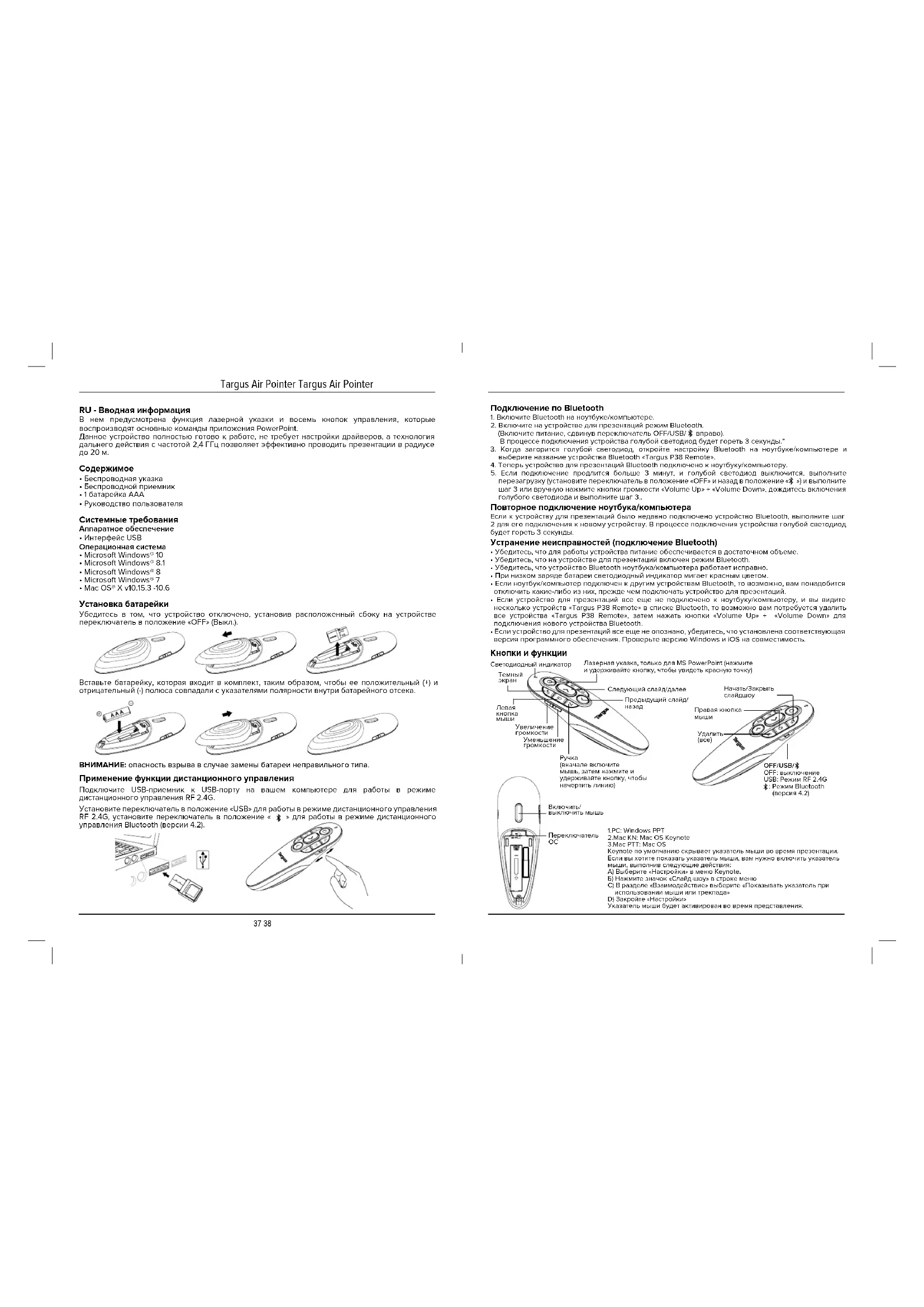 - Mac OS® X v10.15.3 -10.6 Установка батарейки Убедитесь в том, что устройство отключено, установив расположенный сбоку на устройстве переключатель в положение «OFF» (Выкл.). Вставьте батарейку, которая входит в комплект, таким образом, чтобы ее положительный (+) и отрицательный (-) полюса совпадали с указателями полярности внутри батарейного отсека. ВНИМАНИЕ: опасность взрыва в случае замены батареи неправильного типа. Применение функции дистанционного управления Подключите USB-приемник к USB-порту на вашем компьютере для работы в режиме дистанционного управления RF 2.4G. Установите переключатель в положение «USB» для работы в режиме дистанционного управления RF 2.4G, установите переключатель в положение « » для работы в режиме дистанционного управления Bluetooth (версии 4.2). Кнопки и функции Светодиодный индикаторТемный экранСледующий слайд/далееПредыдущий слайд/назадУвеличение громкостиУменьшение громкостиНачать/Закрыть слайдшоуПравая кнопка Удалить (все)Лазерная указка, только для MS PowerPoint (нажмите и удерживайте кнопку, чтобы увидеть красную точку)Переключатель Включить/выключить мышьЛевая кнопка Ручка (вначале включите мышь, затем нажмите и удерживайте кнопку, чтобы начертить линию) Подключение по Bluetooth