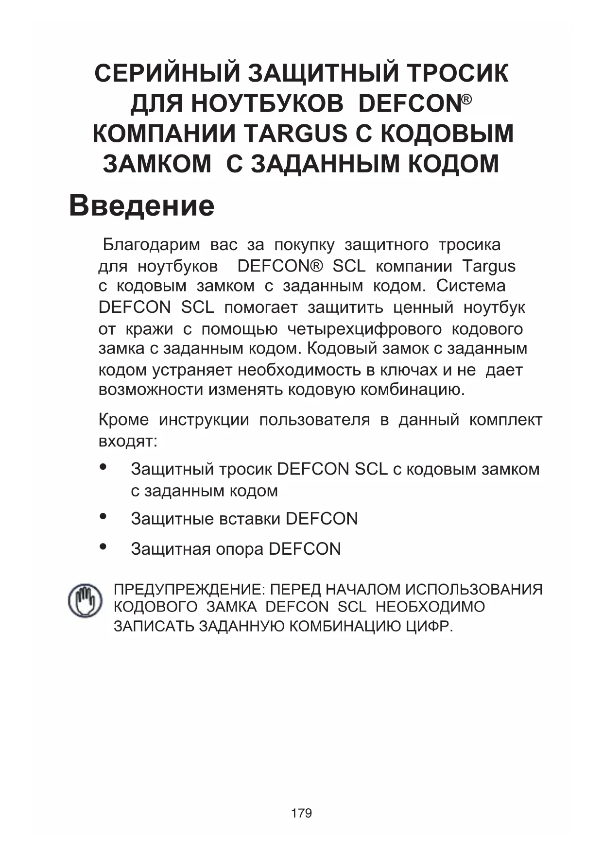 Благодарим вас за покупку защитного тросика для ноутбуков DEFCON® SCL компании Targus с кодовым замком с заданным кодом. Система DEFCON SCL помогает защитить ценный ноутбук от кражи с помощью четырехцифрового кодового замка с заданным кодом. Кодовый замок с заданным кодом устраняет необходимость в ключах и не дает возможности изменять кодовую комбинацию. Кроме инструкции пользователя в данный комплект