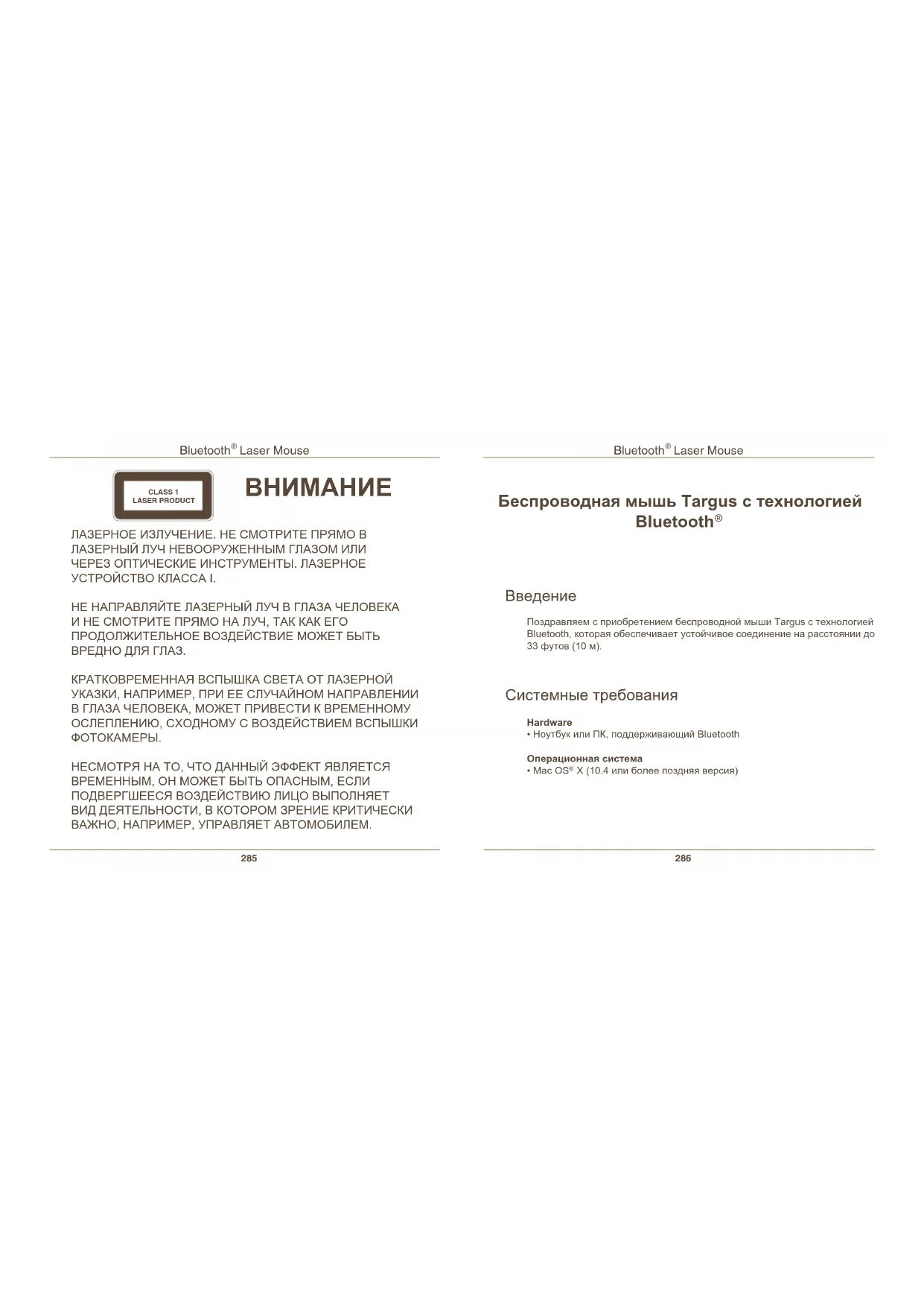 Поздравляем с приобретением беспроводной мыши Targus с технологией Bluetooth, которая обеспечивает устойчивое соединение на расстоянии до 33 футов (10 м). Системные требования Hardware