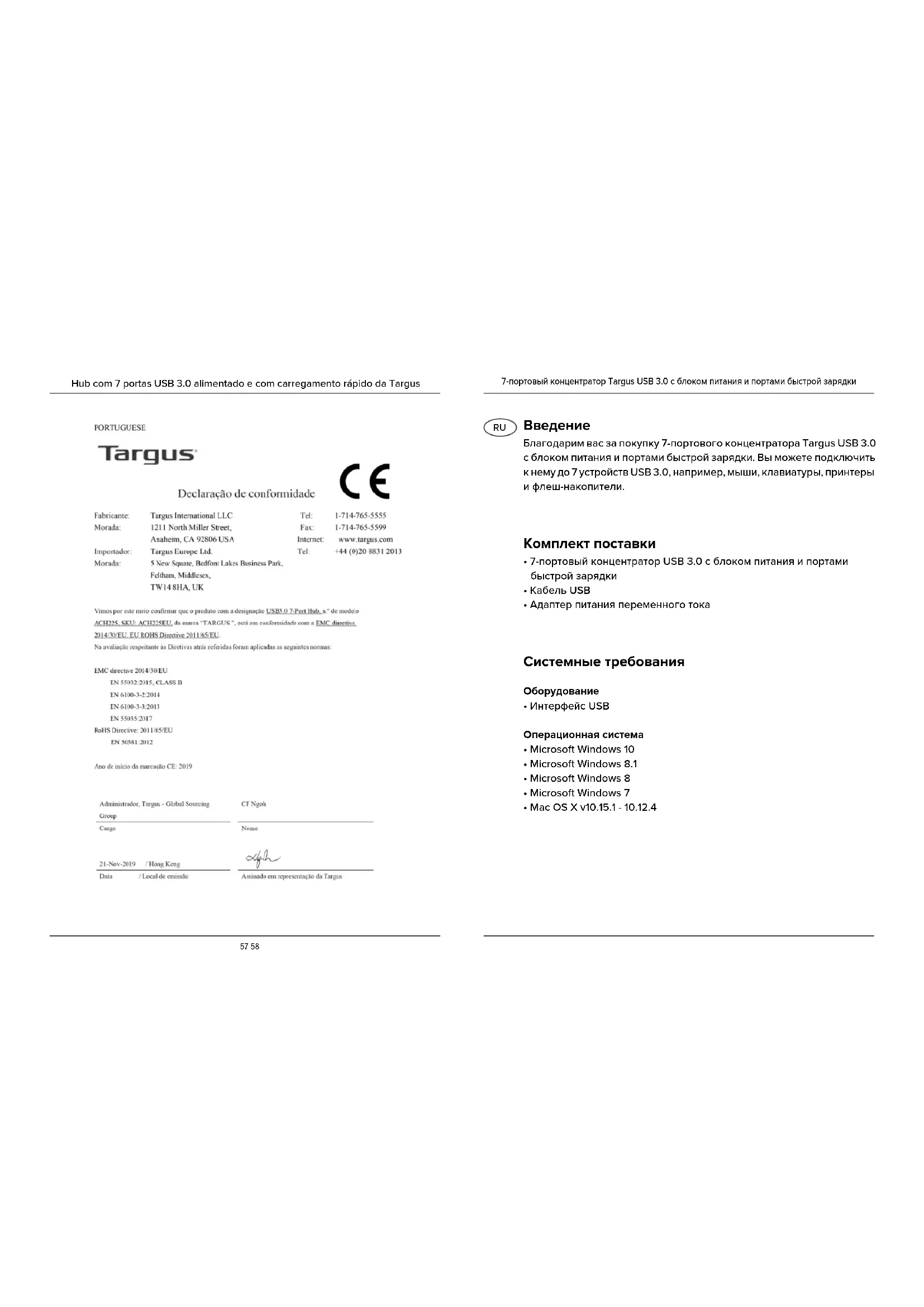 7-портовый концентратор Targus USB 3.0 с блоком питания и портами быстрой зарядки59 60 7-портовый концентратор Targus USB 3.0 с блоком питания и портами быстрой зарядки Подключение концентратора к компьютеру Этот концентратор представляет собой самонастраиваемое устройство. Он начинает работать автоматически после подключения кабеля USB к компьютеру. ПРИМЕЧАНИЕ: ЕСЛИ ПОСЛЕ ПОДКЛЮЧЕНИЯ USB-УСТРОЙСТВ К 7-ПОРТОВОМУ СМАРТ-КОНЦЕНТРАТОРУ ПИТАНИЯ НЕДОСТАТОЧНО, ПОДКЛЮЧИТЕ АДАПТЕР ПИТАНИЯ ПЕРЕМЕННОГО ТОКА ДЛЯ ОБЕСПЕЧЕНИЯ НЕОБХОДИМОГО ПИТАНИЯ. ИСПОЛЬЗУЙТЕ ТОЛЬКО АДАПТЕР ПИТАНИЯ ИЗ КОМПЛЕКТА ПОСТАВКИ. ИСПОЛЬЗОВАНИЕ АДАПТЕРА ПИТАНИЯ ПЕРЕМЕННОГО ТОКА СТОРОННЕГО ПРОИЗВОДИТЕЛЯ МОЖЕТ ПРИВЕСТИ К ПОВРЕЖДЕНИЮ USB-КОНЦЕНТРАТОРА И ДРУГИХ ПОДКЛЮЧЕННЫХ ПЕРИФЕРИЙНЫХ USB-УСТРОЙСТВ И АННУЛИРОВАТЬ ГАРАНТИЮ. Адаптер питания переменного тока Электрические характеристикиВходное напряжение: 100 - 240 В 50/60 Гц Выходное напряжение: 5V 4A ВНИМАНИЕ! Используйте только адаптер питания из комплекта поставки. Использование адаптера питания переменного тока стороннего производителя может привести к повреждению USB-концентратора и других подключенных периферийных USB-устройств и аннулировать гарантию.