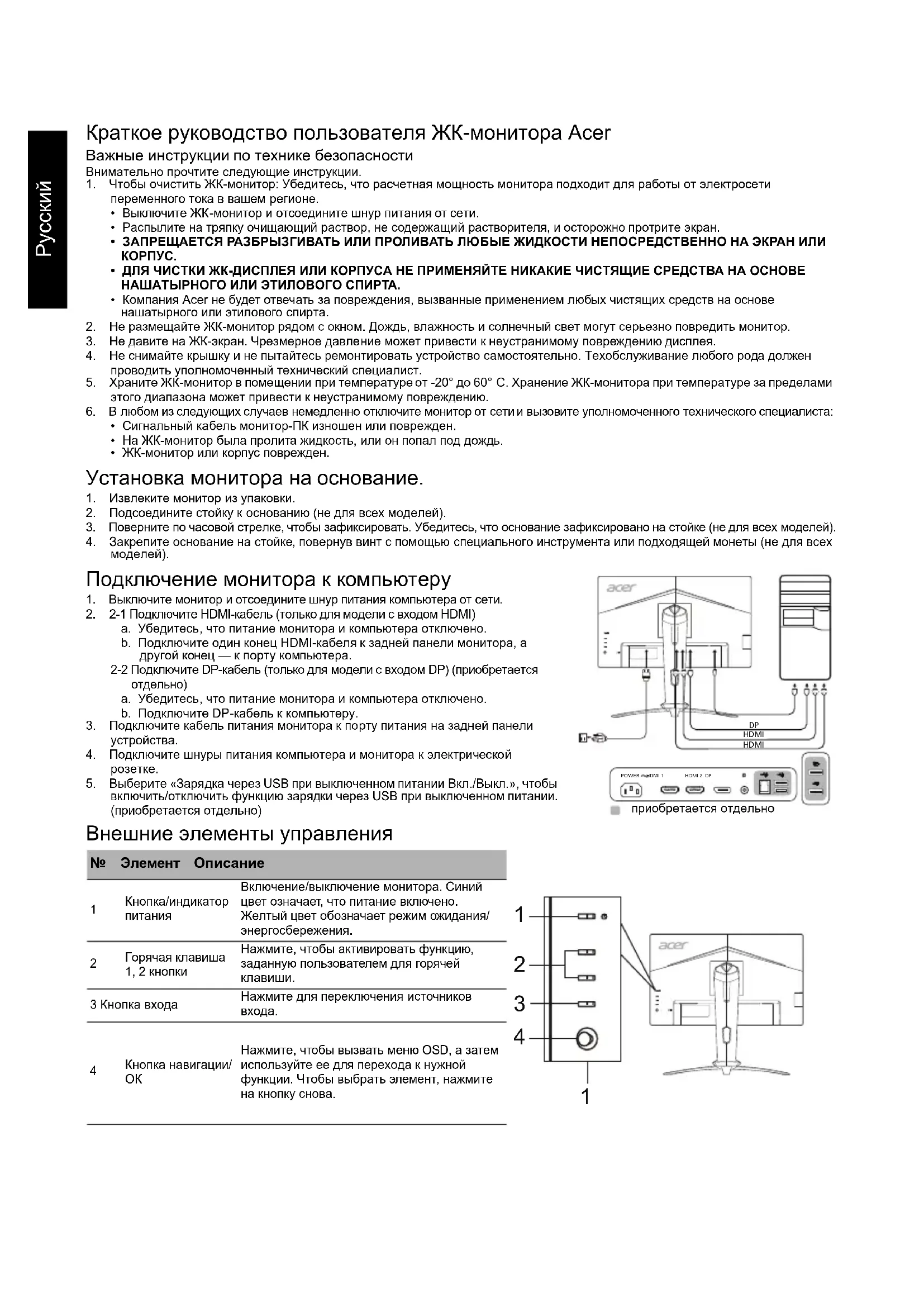 4Русский Правила ипримечания по технике безопасности Примечание FCC Данное устройство было протестировано ипризнано соответствующим ограничениям для цифрового устройства класса B, в соответствии счастью 15 правил FCC. Эти ограничения разработаны для обеспечения приемлемой защиты от вредных помех при установке вжилых помещениях. Данное устройство генерирует, использует иможет излучать радиочастотную энергию. Если оно установлено и используется не в соответствии с инструкциями, оно может вызывать вредные помехи при радиосвязи. Однако, нет никакой гарантии, что помехи не будут возникать вкаждом конкретном случае. Если данное устройство вызывает вредные помехи для приема радио- и телевизионного сигнала, что можно определить, включив ивыключив устройство, пользователю рекомендуется попытаться устранить помехи, выполнив одно или несколько из следующих действий: Переориентировать или переместить приемную антенну. Увеличить расстояние между устройством иприемником. Подключите устройство к розетке вцепи, отличной от той, к которой подключен приемник. Обратитесь за помощью кдилеру или опытному специалисту по радио-/телевизионному оборудованию. Декларация соответствия CE Настоящим компания Acer Inc., заявляет, что данный ЖК-монитор соответствует основным требованиям идругим соответствующим положениям Директивы по электромагнитной совместимости 2014/30/EU, Директивы по низковольтному оборудованию 2014/35/ EU, Директивы об ограничении использования некоторых вредных веществ в электрическом и электронном оборудовании 2011/65/EU и Директивы 2009/125/EC относительно создания основы для установки требований кэкодизайну энергосберегающего продукта. Примечание: Чтобы не повредить монитор, не поднимайте его за основание. Примечание: Экранированные кабели Все подключения кдругим вычислительным устройствам должны производиться спомощью экранированных кабелей в соответствии справилами электромагнитной совместимости. Примечание: Монитор Acer предназначен для воспроизведения видеосигнала и визуального отображения информации, полученной с электронных носителей. Примечание: Периферийные устройства К данному оборудованию можно подключать только периферийные устройства (устройства ввода/вывода, оконечные устройства, принтеры ит. д.), сертифицированные на соответствие ограничениям класса B. Использование несертифицированных периферийных устройств может привести к возникновению помех вприеме радио- и телевизионных сигналов. Предупреждение Изменения или модификации, не одобренные производителем, могут привести к лишению пользователя полномочий на эксплуатацию данного устройства, предоставленных Федеральной комиссией по средствам коммуникаций. Условия эксплуатации Данное устройство соответствует требованиям части 15 правил FCC. Эксплуатация допускается при соблюдении следующих двух условий: (1) данное устройство не должно создавать вредных помех, и (2) данное устройство может принимать любые помехи, включая помехи, которые могут препятствовать нормальной эксплуатации. Примечание: Для пользователей в Канаде Данное цифровое устройство класса B соответствует канадскому стандарту ICES-003. Remarque à l'intention des utilisateurs canadiens Cet appareil numérique de la classe B est conforme à la norme NMB-003 du Canada. Утилизация отслужившего оборудования пользователями из частных домов в стран