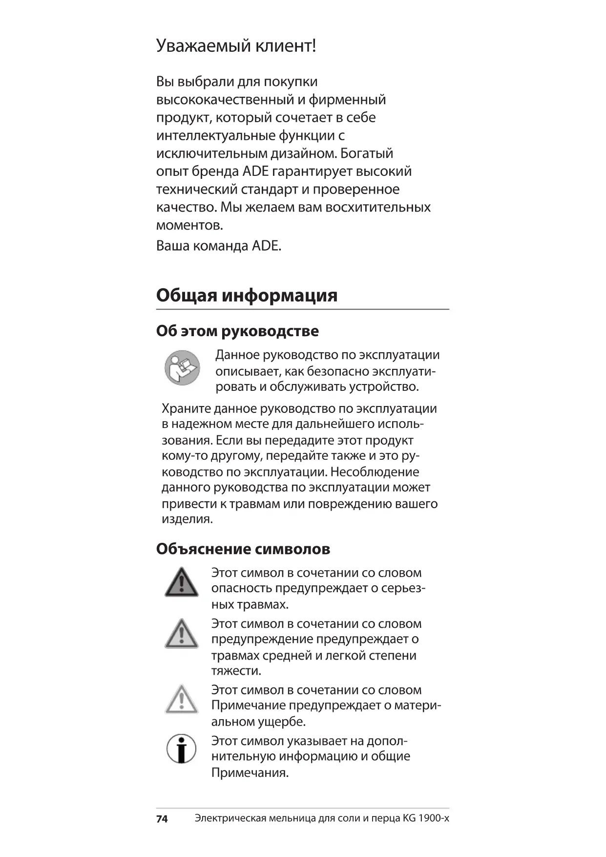 Ваша команда ADE. Общая информация Об этом руководстве Данное руководство по эксплуатации описывает, как безопасно эксплуати- ровать и обслуживать устройство. Храните данное руководство по эксплуатации в надежном месте для дальнейшего исполь- зования. Если вы передадите этот продукт кому-то другому, передайте также и это ру- ководство по эксплуатации. Несоблюдение данного руководства по эксплуатации может привести к травмам или повреждению вашего
