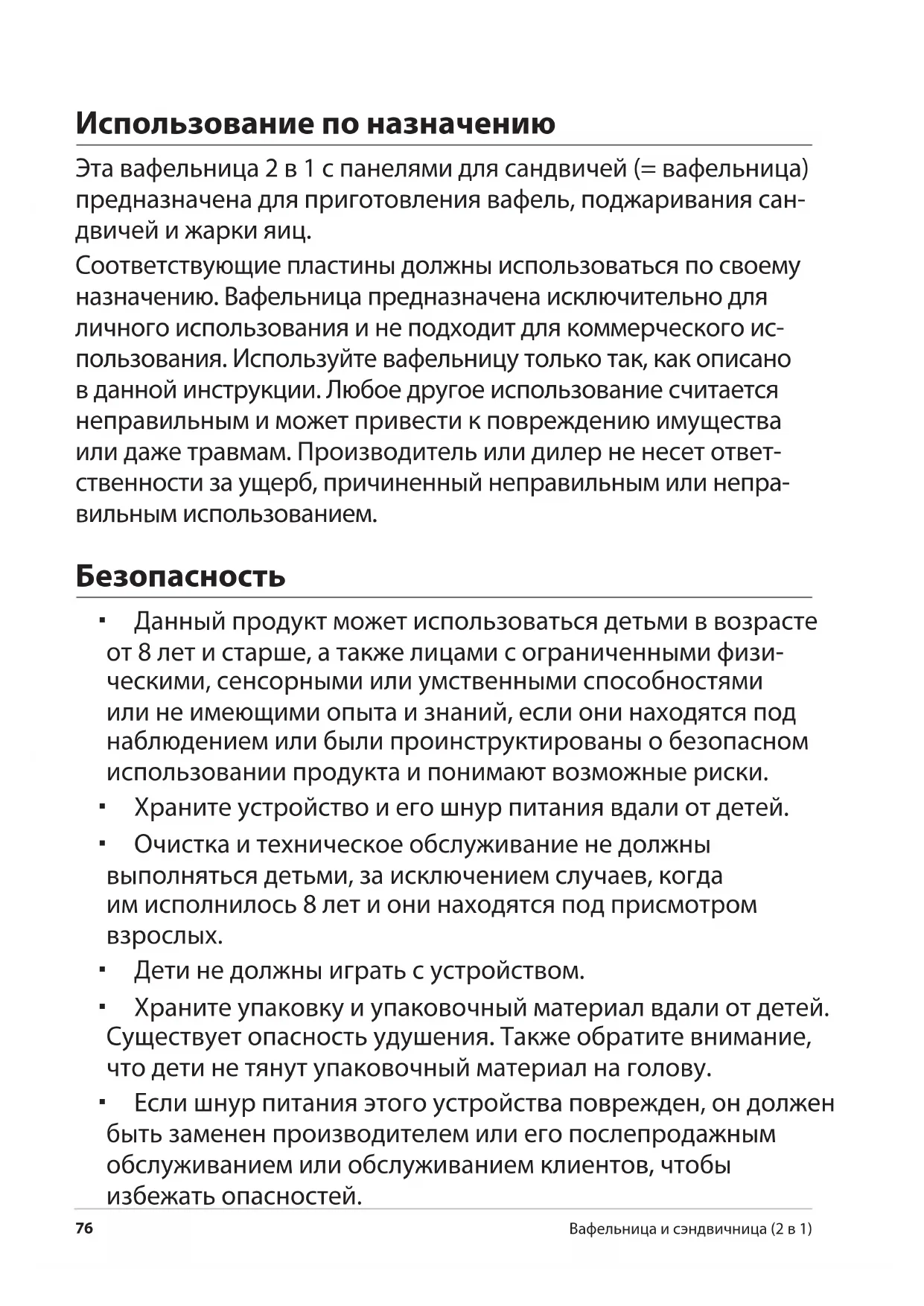 Вафельница и сэндвичница (2 в 1) Использование по назначению Эта вафельница 2 в 1 с панелями для сандвичей (= вафельница) предназначена для приготовления вафель, поджаривания сан- двичей и жарки яиц. Соответствующие пластины должны использоваться по своему назначению. Вафельница предназначена исключительно для личного использования и не подходит для коммерческого ис- пользования. Используйте вафельницу только так, как описано в данной инструкции. Любое другое использование считается неправильным и может привести к повреждению имущества или даже травмам. Производитель или дилер не несет ответ- ственности за ущерб, причиненный неправильным или непра- вильным использованием. Безопасность Данный продукт может использоваться детьми в возрасте от 8 лет и старше, а также лицами с ограниченными физи- ческими, сенсорными или умственными способностями или не имеющими опыта и знаний, если они находятся под наблюдением или были проинструктированы о безопасном использовании продукта и понимают возможные риски. Храните устройство и его шнур питания вдали от детей. Очистка и техническое обслуживание не должны выполняться детьми, за исключением случаев, когда им исполнилось 8 лет и они находятся под присмотром
