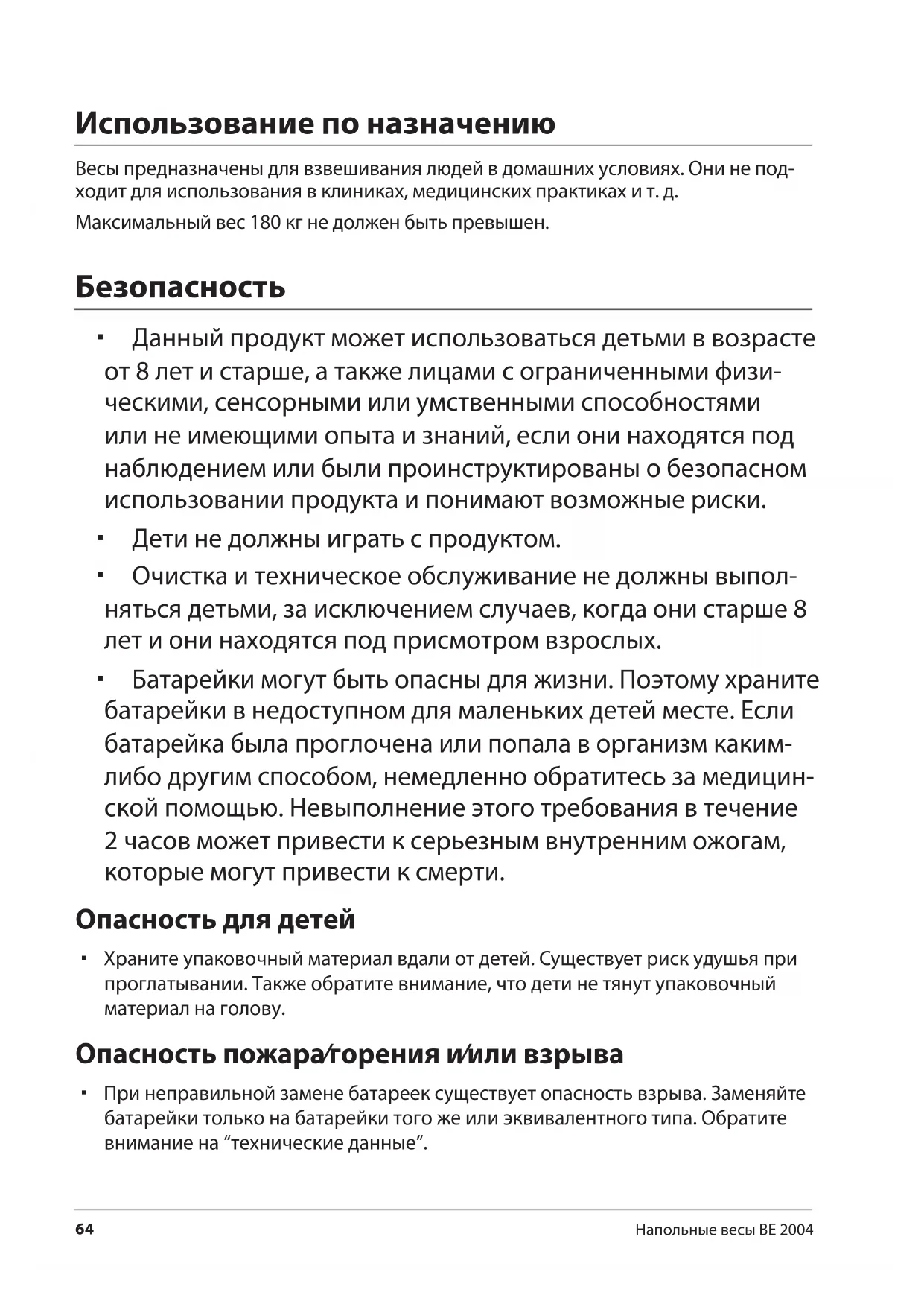 Напольные весы BE 2004 Использование по назначению Весы предназначены для взвешивания людей в домашних условиях. Они не под- ходит для использования в клиниках, медицинских практиках и т. д. Максимальный вес 180 кг не должен быть превышен. Безопасность Данный продукт может использоваться детьми в возрасте от 8 лет и старше, а также лицами с ограниченными физи- ческими, сенсорными или умственными способностями или не имеющими опыта и знаний, если они находятся под наблюдением или были проинструктированы о безопасном использовании продукта и понимают возможные риски. Дети не должны играть с продуктом. Очистка и техническое обслуживание не должны выпол- няться детьми, за исключением случаев, когда они старше 8 лет и они находятся под присмотром взрослых. Батарейки могут быть опасны для жизни. Поэтому храните батарейки в недоступном для маленьких детей месте. Если батарейка была проглочена или попала в организм каким- либо другим способом, немедленно обратитесь за медицин- ской помощью. Невыполнение этого требования в течение 2 часов может привести к серьезным внутренним ожогам, которые могут привести к смерти. Опасность для детей Храните упаковочный материал вдали от детей. Существует риск удушья при проглатывании. Также обратите внимание, что дети не тянут упаковочный материал на голову. Опасность пожара/горения и/или взрыва При неправильной замене батареек существует опасность взрыва. Заменяйте батарейки только на батарейки того же или эквивалентного типа. Обратите внимание на “технические данные”.Безопасность