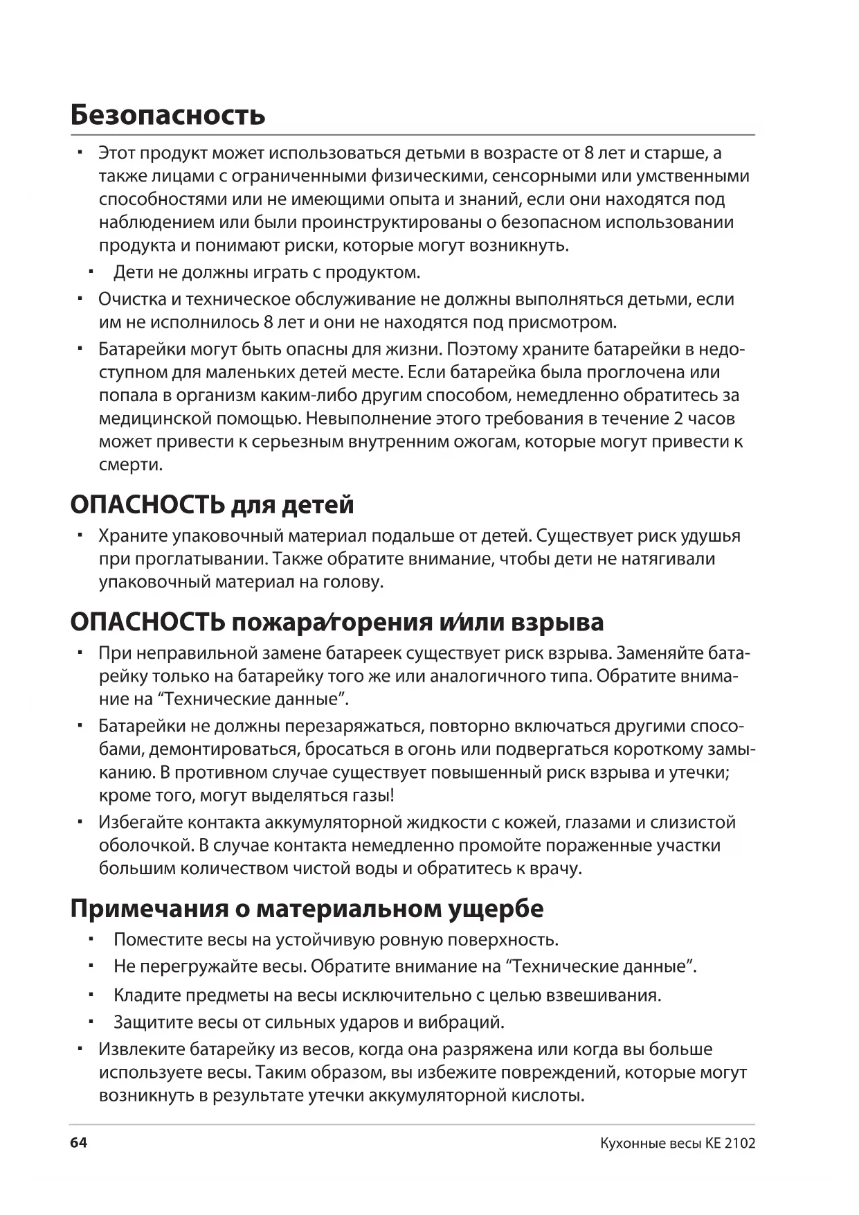 Кухонные весы KE 2102 Безопасность Этот продукт может использоваться детьми в возрасте от 8 лет и старше, а также лицами с ограниченными физическими, сенсорными или умственными способностями или не имеющими опыта и знаний, если они находятся под наблюдением или были проинструктированы о безопасном использовании продукта и понимают риски, которые могут возникнуть. Дети не должны играть с продуктом. Очистка и техническое обслуживание не должны выполняться детьми, если им не исполнилось 8 лет и они не находятся под присмотром. Батарейки могут быть опасны для жизни. Поэтому храните батарейки в недо- ступном для маленьких детей месте. Если батарейка была проглочена или попала в организм каким-либо другим способом, немедленно обратитесь за медицинской помощью. Невыполнение этого требования в течение 2 часов может привести к серьезным внутренним ожогам, которые могут привести к