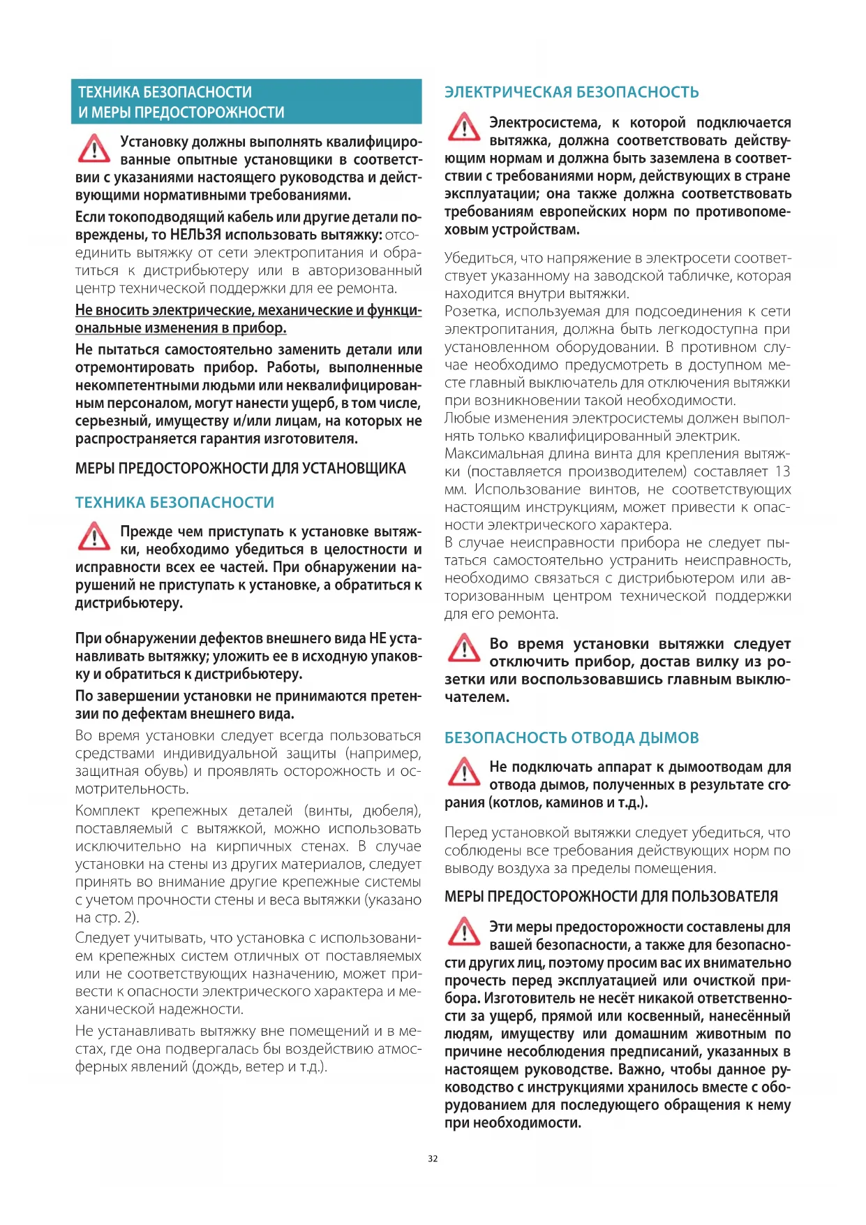 зии по дефектам внешнего вида. Во время установки следует всегда пользоваться средствами индивидуальной защиты (например, защитная обувь) и проявлять осторожность и ос- мотрительность. Комплект крепежных деталей (винты, дюбеля), поставляемый с вытяжкой, можно использовать исключительно на кирпичных стенах. В случае установки на стены из других материалов, следует принять во внимание другие крепежные системы с учетом прочности стены и веса вытяжки (указано на стр. 2). Следует учитывать, что установка с использовани- ем крепежных систем отличных от поставляемых или не соответствующих назначению, может при- вести к опасности электрического характера и ме- ханической надежности. Не устанавливать вытяжку вне помещений и в ме- стах, где она подвергалась бы воздействию атмос- ферных явлений (дождь, ветер и т.д.). ЭЛЕКТРИЧЕСКАЯ БЕЗОПАСНОСТЬ Электросистема, к которой подключается вытяжка, должна соответствовать действу