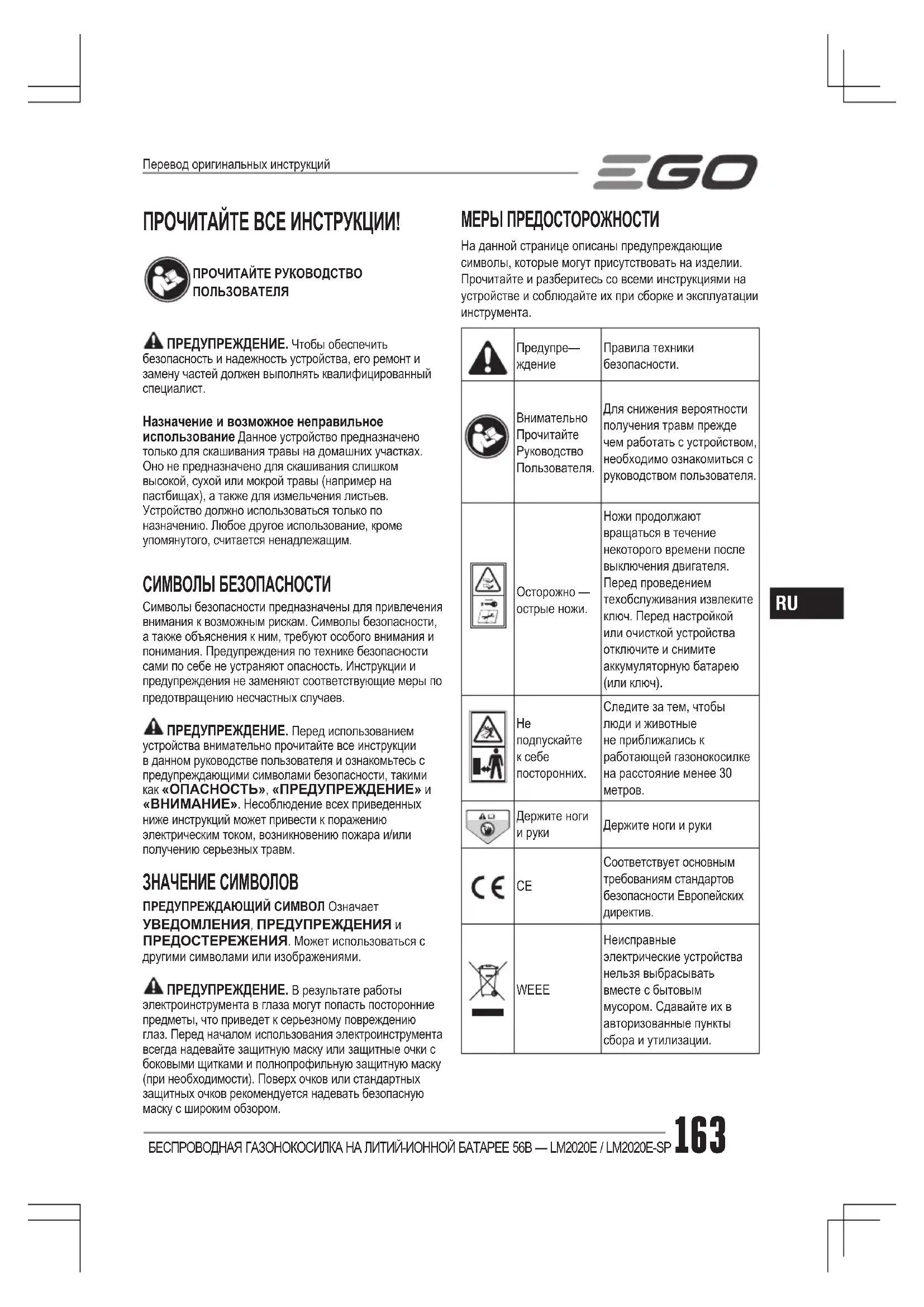 ПРОЧИТАЙТЕ ВСЕ ИНСТРУКЦИИ! ПРОЧИТАЙТЕ РУКОВОДСТВО ПОЛЬЗОВАТЕЛЯ ПРЕДУПРЕЖДЕНИЕ. Чтобы обеспечить безопасность и надежность устройства, его ремонт и замену частей должен выполнять квалифицированный специалист. Назначение и возможное неправильное использование Данное устройство предназначено только для скашивания травы на домашних участках. Оно не предназначено для скашивания слишком высокой, сухой или мокрой травы (например на пастбищах), а также для измельчения листьев. Устройство должно использоваться только по назначению. Любое другое использование, кроме упомянутого, считается ненадлежащим. СИМВОЛЫ БЕЗОПАСНОСТИ Символы безопасности предназначены для привлечения внимания к возможным рискам. Символы безопасности, а также объяснения к ним, требуют особого внимания и понимания. Предупреждения по технике безопасности сами по себе не устраняют опасность. Инструкции и предупреждения не заменяют соответствующие меры по предотвращению несчастных случаев. ПРЕДУПРЕЖДЕНИЕ. Перед использованием устройства внимательно прочитайте все инструкции в данном руководстве пользователя и ознакомьтесь с предупреждающими символами безопасности, такими как «ОПАСНОСТЬ», «ПРЕДУПРЕЖДЕНИЕ» и «ВНИМАНИЕ». Несоблюдение всех приведенных ниже инструкций может привести к поражению электрическим током, возникновению пожара и/или получению серьезных травм. ЗНАЧЕНИЕ СИМВОЛОВ ПРЕДУПРЕЖДАЮЩИЙ СИМВОЛ Означает УВЕДОМЛЕНИЯ, ПРЕДУПРЕЖДЕНИЯ и ПРЕДОСТЕРЕЖЕНИЯ. Может использоваться с другими символами или изображениями. ПРЕДУПРЕЖДЕНИЕ. В результате работы электроинструмента в глаза могут попасть посторонние предметы, что приведет к серьезному повреждению глаз. Перед началом использования электроинструмента всегда надевайте защитную маску или защитные очки с боковыми щитками и полнопрофильную защитную маску (при необходимости). Поверх очков или стандартных защитных очков рекомендуется надевать безопасную маску с широким обзором. МЕРЫ ПРЕДОСТОРОЖНОСТИ На данной странице описаны предупреждающие символы, которые могут присутствовать на изделии. Прочитайте и разберитесь со всеми инструкциями на устройстве и соблюдайте их при сборке и эксплуатации инструмента.Предупре— ждениеПравила техники безопасности.Внимательно Прочитайте Руководство Пользователя.Для снижения вероятности получения травм прежде чем работать с устройством, необходимо ознакомиться с руководством пользователя.Осторожно — острые ножи.Ножи продолжают вращаться в течение некоторого времени после выключения двигателя. Перед проведением техобслуживания извлеките ключ. Перед настройкой или очисткой устройства отключите и снимите аккумуляторную батарею (или ключ). подпускайте к себе посторонних.Следите за тем, чтобы люди и животные не приближались к работающей газонокосилке на расстояние менее 30 метров.Держите ноги и рукиДержите ноги и руки Соответствует основным требованиям стандартов безопасности Европейских директив.WEEE Неисправные электрические устройства нельзя выбрасывать вместе с бытовым мусором. Сдавайте их в авторизованные пункты сбора и утилизации.Перевод оригинальных инструкцийБЕСПРОВОДНАЯ ГАЗОНОКОСИЛКА НА ЛИТИЙ-ИОННОЙ БАТАРЕЕ 56В — LM2020E / LM2020E-SP164