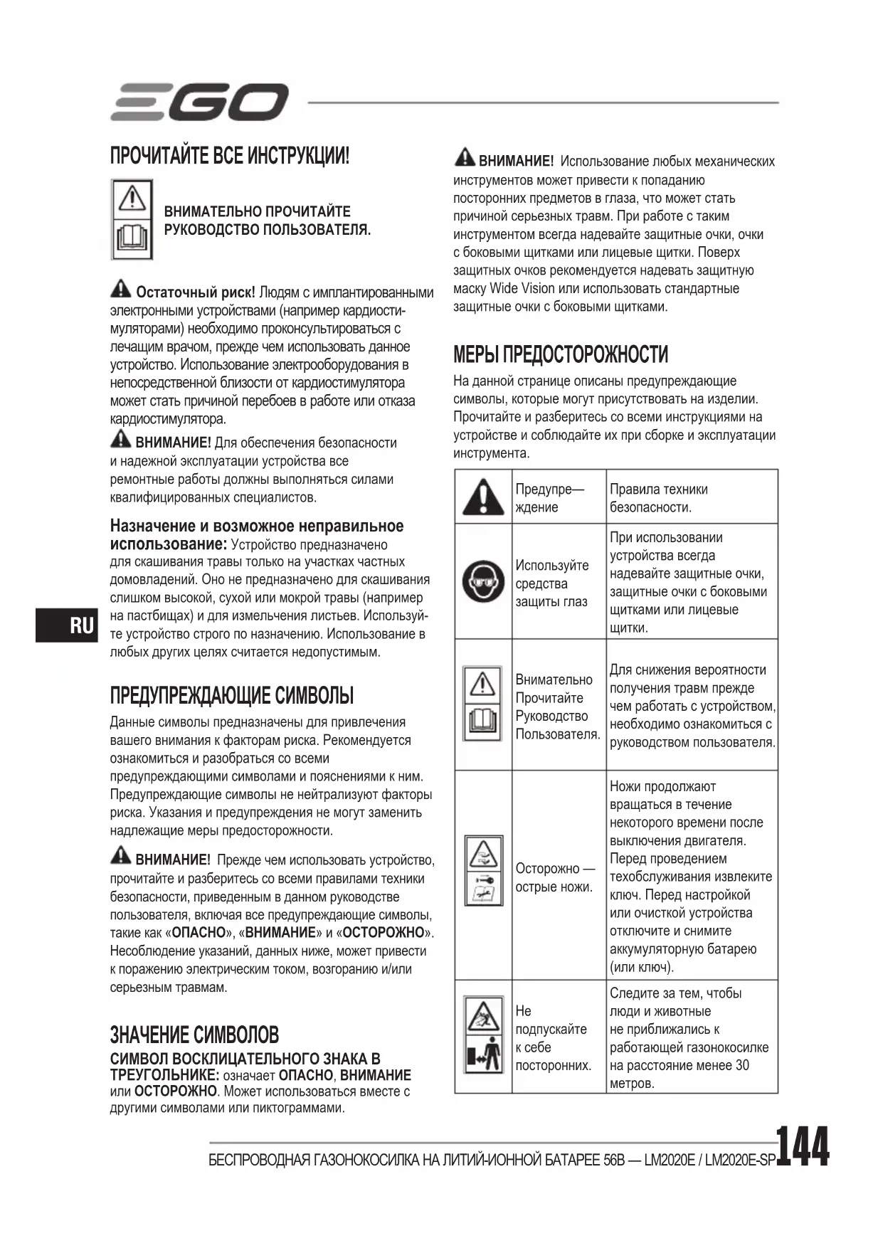 ПРОЧИТАЙТЕ ВСЕ ИНСТРУКЦИИ! ВНИМАТЕЛЬНО ПРОЧИТАЙТЕ РУКОВОДСТВО ПОЛЬЗОВАТЕЛЯ. Остаточный риск! Людям с имплантированными электронными устройствами (например кардиости- муляторами) необходимо проконсультироваться с лечащим врачом, прежде чем использовать данное устройство. Использование электрооборудования в непосредственной близости от кардиостимулятора может стать причиной перебоев в работе или отказа кардиостимулятора. ВНИМАНИЕ! Для обеспечения безопасности и надежной эксплуатации устройства все ремонтные работы должны выполняться силами квалифицированных специалистов. Назначение и возможное неправильное использование: Устройство предназначено для скашивания травы только на участках частных домовладений. Оно не предназначено для скашивания слишком высокой, сухой или мокрой травы (например на пастбищах) и для измельчения листьев. Используй-те устройство строго по назначению. Использование в любых других целях считается недопустимым. ПРЕДУПРЕЖДАЮЩИЕ СИМВОЛЫ Данные символы предназначены для привлечения вашего внимания к факторам риска. Рекомендуется ознакомиться и разобраться со всеми предупреждающими символами и пояснениями к ним. Предупреждающие символы не нейтрализуют факторы риска. Указания и предупреждения не могут заменить надлежащие меры предосторожности. ВНИМАНИЕ! Прежде чем использовать устройство, прочитайте и разберитесь со всеми правилами техники безопасности, приведенным в данном руководстве пользователя, включая все предупреждающие символы, такие как «ОПАСНО», «ВНИМАНИЕ» и «ОСТОРОЖНО». Несоблюдение указаний, данных ниже, может привести к поражению электрическим током, возгоранию и/или серьезным травмам. ЗНАЧЕНИЕ СИМВОЛОВ СИМВОЛ ВОСКЛИЦАТЕЛЬНОГО ЗНАКА В ТРЕУГОЛЬНИКЕ: означает ОПАСНО, ВНИМАНИЕ или ОСТОРОЖНО. Может использоваться вместе с другими символами или пиктограммами. ВНИМАНИЕ! Использование любых механических инструментов может привести к попаданию посторонних предметов в глаза, что может стать причиной серьезных травм. При работе с таким инструментом всегда надевайте защитные очки, очки с боковыми щитками или лицевые щитки. Поверх защитных очков рекомендуется надевать защитную маску Wide Vision или использовать стандартные защитные очки с боковыми щитками. МЕРЫ ПРЕДОСТОРОЖНОСТИ На данной странице описаны предупреждающие символы, которые могут присутствовать на изделии. Прочитайте и разберитесь со всеми инструкциями на устройстве и соблюдайте их при сборке и эксплуатации инструмента.Предупре— ждениеПравила техники безопасности.Используйте средства защиты глазПри использовании устройства всегда надевайте защитные очки, защитные очки с боковыми щитками или лицевые щитки.Внимательно Прочитайте Руководство Пользователя.Для снижения вероятности получения травм прежде чем работать с устройством, необходимо ознакомиться с руководством пользователя.Осторожно — острые ножи.Ножи продолжают вращаться в течение некоторого времени после выключения двигателя. Перед проведением техобслуживания извлеките ключ. Перед настройкой или очисткой устройства отключите и снимите аккумуляторную батарею (или ключ). подпускайте к себе посторонних.Следите за тем, чтобы люди и животные не приближались к работающей газонокосилке на расстояние менее 30 метров.БЕСПРОВОДНАЯ ГАЗОНОКО