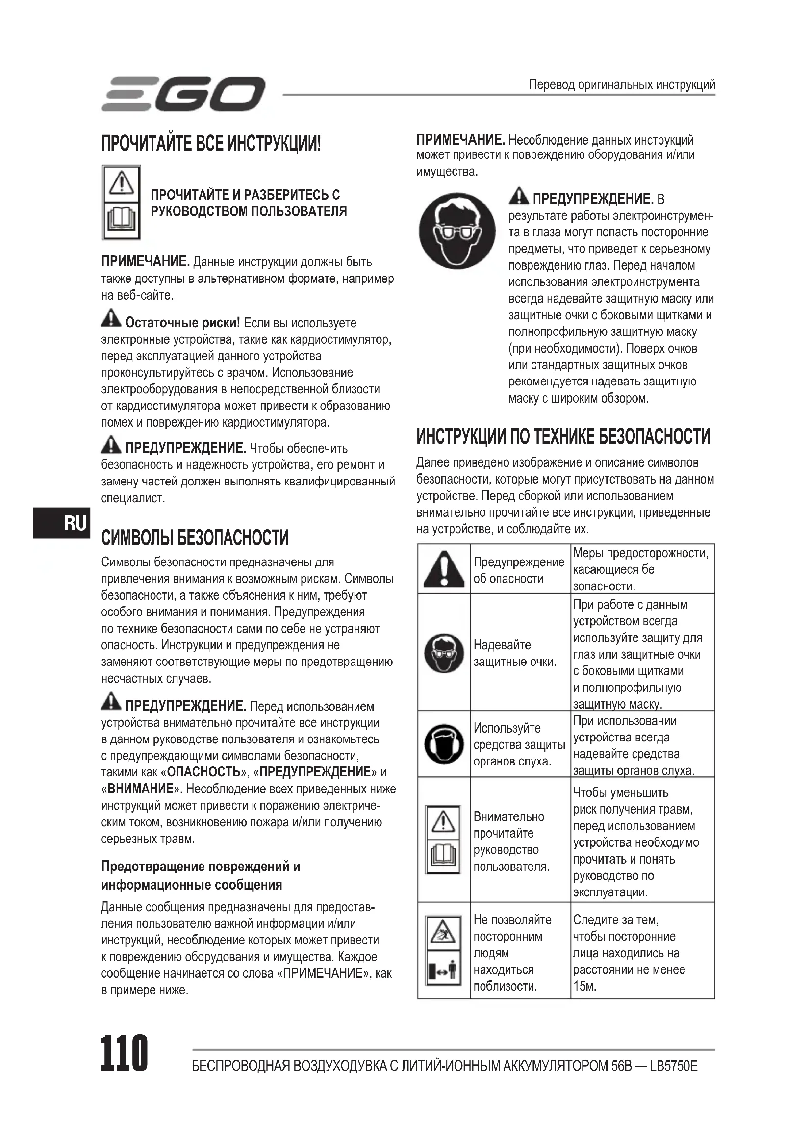 ПРОЧИТАЙТЕ ВСЕ ИНСТРУКЦИИ! ПРОЧИТАЙТЕ И РАЗБЕРИТЕСЬ С РУКОВОДСТВОМ ПОЛЬЗОВАТЕЛЯ ПРИМЕЧАНИЕ. Данные инструкции должны быть также доступны в альтернативном формате, например на веб-сайте. Остаточные риски! Если вы используете электронные устройства, такие как кардиостимулятор, перед эксплуатацией данного устройства проконсультируйтесь с врачом. Использование электрооборудования в непосредственной близости от кардиостимулятора может привести к образованию помех и повреждению кардиостимулятора. ПРЕДУПРЕЖДЕНИЕ. Чтобы обеспечить безопасность и надежность устройства, его ремонт и замену частей должен выполнять квалифицированный специалист. СИМВОЛЫ БЕЗОПАСНОСТИ Символы безопасности предназначены для привлечения внимания к возможным рискам. Символы безопасности, а также объяснения к ним, требуют особого внимания и понимания. Предупреждения по технике безопасности сами по себе не устраняют опасность. Инструкции и предупреждения не заменяют соответствующие меры по предотвращению несчастных случаев. ПРЕДУПРЕЖДЕНИЕ. Перед использованием устройства внимательно прочитайте все инструкции в данном руководстве пользователя и ознакомьтесь с предупреждающими символами безопасности, такими как «ОПАСНОСТЬ», «ПРЕДУПРЕЖДЕНИЕ» и «ВНИМАНИЕ». Несоблюдение всех приведенных ниже инструкций может привести к поражению электриче-ским током, возникновению пожара и/или получению серьезных травм. Предотвращение повреждений и информационные сообщения Данные сообщения предназначены для предостав-ления пользователю важной информации и/или инструкций, несоблюдение которых может привести к повреждению оборудования и имущества. Каждое сообщение начинается со слова «ПРИМЕЧАНИЕ», как в примере ниже. ПРИМЕЧАНИЕ. Несоблюдение данных инструкций может привести к повреждению оборудования и/или имущества. ПРЕДУПРЕЖДЕНИЕ. В результате работы электроинструмен-та в глаза могут попасть посторонние предметы, что приведет к серьезному повреждению глаз. Перед началом использования электроинструмента всегда надевайте защитную маску или защитные очки с боковыми щитками и полнопрофильную защитную маску (при необходимости). Поверх очков или стандартных защитных очков рекомендуется надевать защитную маску с широким обзором. ИНСТРУКЦИИ ПО ТЕХНИКЕ БЕЗОПАСНОСТИ Далее приведено изображение и описание символов безопасности, которые могут присутствовать на данном устройстве. Перед сборкой или использованием внимательно прочитайте все инструкции, приведенные на устройстве, и соблюдайте их.Предупреждение об опасностиМеры предосторожности, касающиеся бе зопасности.Надевайте защитные очки.При работе с данным устройством всегда используйте защиту для глаз или защитные очки с боковыми щитками и полнопрофильную защитную маску.Используйте средства защиты органов слуха.При использовании устройства всегда надевайте средства защиты органов слуха. Внимательно прочитайте руководство пользователя.Чтобы уменьшить риск получения травм, перед использованием устройства необходимо прочитать и понять руководство по эксплуатации.Не позволяйте посторонним людям находиться поблизости.Следите за тем, чтобы посторонние лица находились на расстоянии не менее 15м. Перевод оригинальных инструкцийБЕСПРОВОДНАЯ ВОЗДУХОДУВКА С ЛИТИЙ-ИОННЫМ АККУМУЛЯТОР