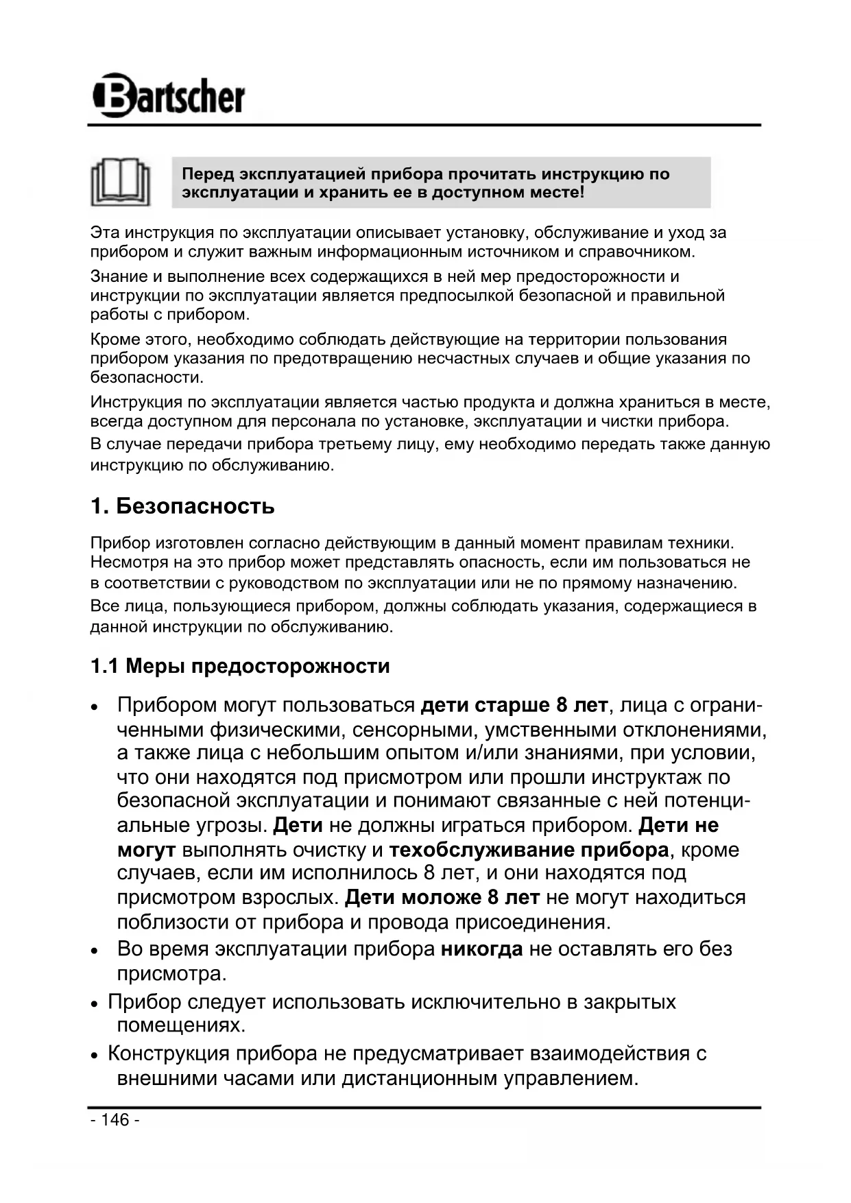 Прибором могут пользоваться дети старше 8 лет, лица с ограни- ченными физическими, сенсорными, умственными отклонениями, а также лица с небольшим опытом и/или знаниями, при условии, что они находятся под присмотром или прошли инструктаж по безопасной эксплуатации и понимают связанные с ней потенци- альные угрозы. Дети не должны играться прибором. Дети не могут выполнять очистку и техобслуживание прибора, кроме случаев, если им исполнилось 8 лет, и они находятся под присмотром взрослых. Дети моложе 8 лет не могут находиться поблизости от прибора и провода присоединения. Во время эксплуатации прибора никогда не оставлять его без