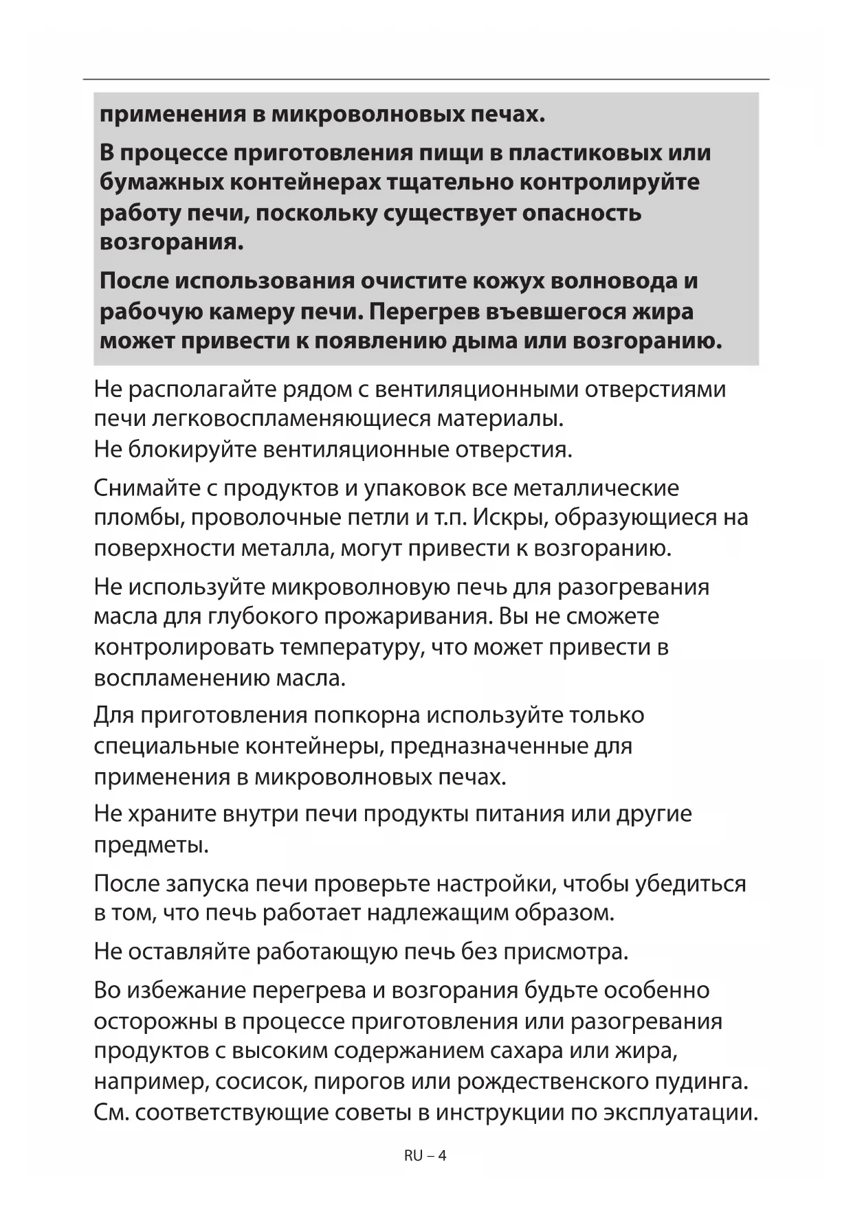 После запуска печи проверьте настройки, чтобы убедиться в том, что печь работает надлежащим образом. Не оставляйте работающую печь без присмотра. Во избежание перегрева и возгорания будьте особенно осторожны в процессе приготовления или разогревания продуктов с высоким содержанием сахара или жира, например, сосисок, пирогов или рождественского пудинга. См. соответствующие советы в инструкции по эксплуатации.RU RU – 4RU – 4 применения в микроволновых печах. В процессе приготовления пищи в пластиковых или бумажных контейнерах тщательно контролируйте работу печи, поскольку существует опасность возгорания. После использования очистите кожух волновода и рабочую камеру печи. Перегрев въевшегося жира может привести к появлению дыма или возгоранию. Не располагайте рядом с вентиляционными отверстиями печи легковоспламеняющиеся материалы. Не блокируйте вентиляционные отверстия. Снимайте с продуктов и упаковок все металлические пломбы, проволочные петли и т.п. Искры, образующиеся на поверхности металла, могут привести к возгоранию. Не используйте микроволновую печь для разогревания масла для глубокого прожаривания. Вы не сможете контролировать температуру, что может привести в воспламенению масла. Для приготовления попкорна используйте только специальные контейнеры, предназначенные для применения в микроволновых печах. Не храните внутри печи продукты питания или другие