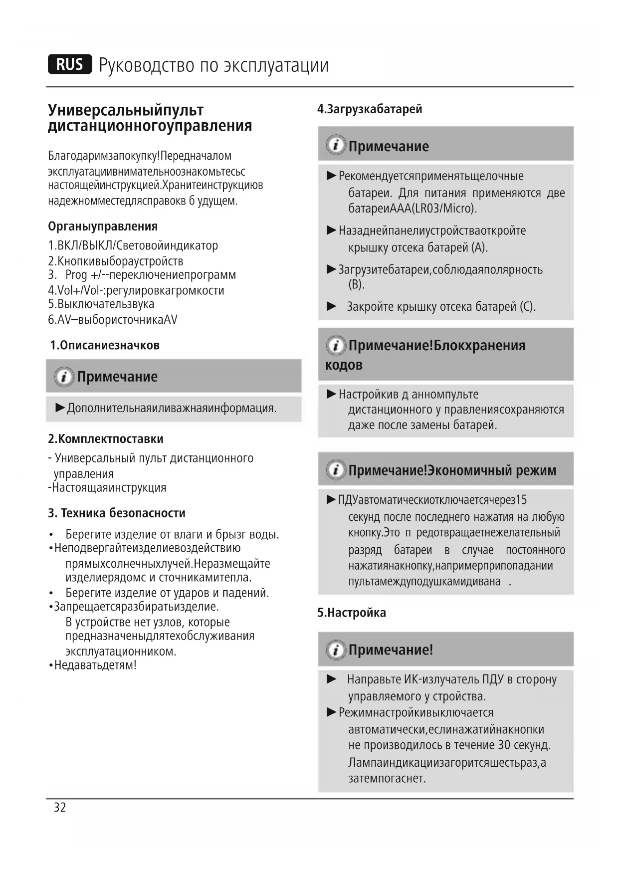 ► Встроенные блок памяти вмещает до 350 кодов. Таккак количество TV/STB-приборов чрезвычайно велико, возможно будут работать толькоосновные функции ПДУ. В этомслучае повторите пункты 5.2.1 -5.2.5, чтобы найти более подходящий код. Для некоторых специфичных моделей устройств, возможно, коды не предусмотрены.