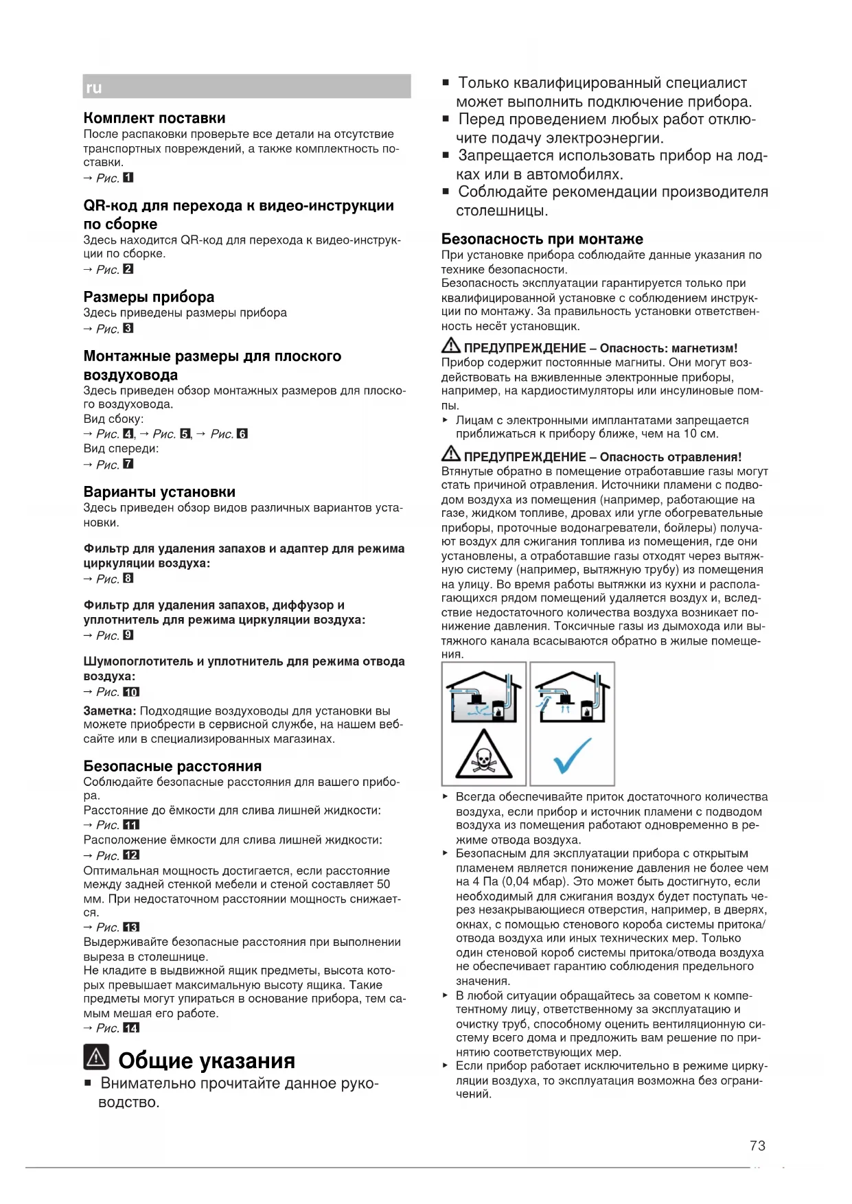 ¡ Только квалифицированный специалист может выполнить подключение прибора. ¡ Перед проведением любых работ отклю- чите подачу электроэнергии. ¡ Запрещается использовать прибор на лод- ках или в автомобилях. ¡ Соблюдайте рекомендации производителя столешницы. Безопасность при монтаже При установке прибора соблюдайте данные указания потехнике безопасности.Безопасность эксплуатации гарантируется только приквалифицированной установке с соблюдением инструк-ции по монтажу. За правильность установки ответствен-ность несёт установщик.ПРЕДУПРЕЖДЕНИЕ‒Опасность: магнетизм!Прибор содержит постоянные магниты. Они могут воз-действовать на вживленные электронные приборы,например, на кардиостимуляторы или инсулиновые пом- ▶ Лицам с электронными имплантатами запрещаетсяприближаться к прибору ближе, чем на 10см.ПРЕДУПРЕЖДЕНИЕ‒Опасность отравления!Втянутые обратно в помещение отработавшие газы могутстать причиной отравления. Источники пламени с подво-дом воздуха из помещения (например, работающие нагазе, жидком топливе, дровах или угле обогревательныеприборы, проточные водонагреватели, бойлеры) получа-ют воздух для сжигания топлива из помещения, где ониустановлены, а отработавшие газы отходят через вытяж-ную систему (например, вытяжную трубу) из помещенияна улицу. Во время работы вытяжки из кухни и распола-гающихся рядом помещений удаляется воздух и, вслед-ствие недостаточного количества воздуха возникает по-нижение давления. Токсичные газы из дымохода или вы-тяжного канала всасываются обратно в жилые помеще-ния. ▶ Всегда обеспечивайте приток достаточного количествавоздуха, если прибор и источник пламени с подводомвоздуха из помещения работают одновременно в ре-жиме отвода воздуха.▶ Безопасным для эксплуатации прибора с открытымпламенем является понижение давления не более чемна 4 Па (0,04 мбар). Это может быть достигнуто, еслинеобходимый для сжигания воздух будет поступать че-рез незакрывающиеся отверстия, например, в дверях,окнах, с помощью стенового короба системы притока/отвода воздуха или иных технических мер. Толькоодин стеновой короб системы притока/отвода воздухане обеспечивает гарантию соблюдения предельногозначения.▶ В любой ситуации обращайтесь за советом к компе-тентному лицу, ответственному за эксплуатацию иочистку труб, способному оценить вентиляционную си-стему всего дома и предложить вам решение по при-нятию соответствующих мер.▶ Если прибор работает исключительно в режиме цирку-ляции воздуха, то эксплуатация возможна без ограни-чений.74 ПРЕДУПРЕЖДЕНИЕ‒Опасность возгорания! Отложения жира в жироулавливающем фильтре могут