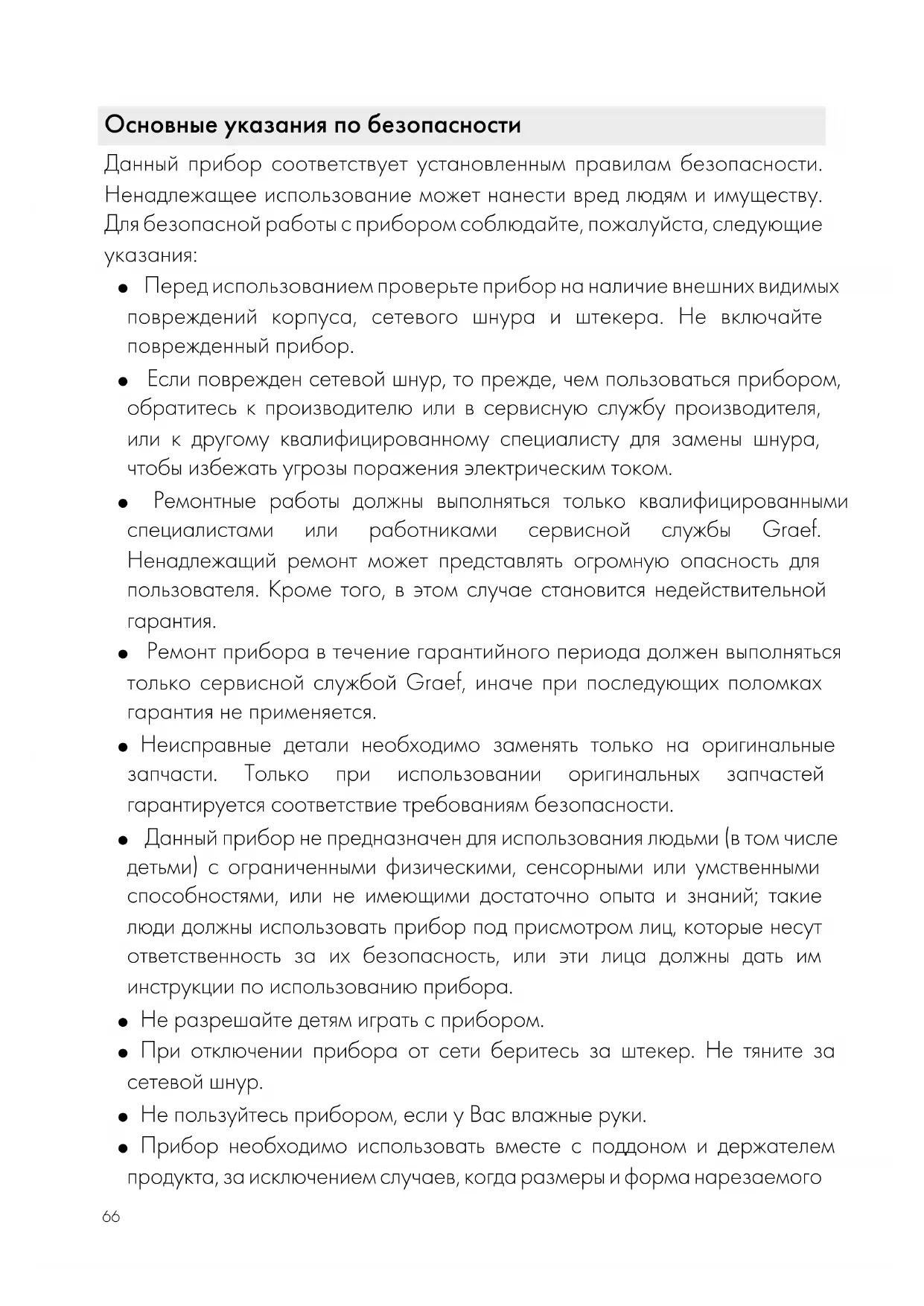 ● Ремонт прибора в течение гарантийного периода должен выполняться только сервисной службой Graef, иначе при последующих поломках гарантия не применяется. ● Неисправные детали необходимо заменять только на оригинальные запчасти. Только при использовании оригинальных запчастей гарантируется соответствие требованиям безопасности. ● Данный прибор не предназначен для использования людьми (в том числе детьми) с ограниченными физическими, сенсорными или умственными способностями, или не имеющими достаточно опыта и знаний; такие люди должны использовать прибор под присмотром лиц, которые несут ответственность за их безопасность, или эти лица должны дать им инструкции по использованию прибора. ● Не разрешайте детям играть с прибором. ● При отключении прибора от сети беритесь за штекер. Не тяните за сетевой шнур. ● Не пользуйтесь прибором, если у Вас влажные руки. ● Прибор необходимо использовать вместе с поддоном и держателем продукта, за исключением случаев, когда размеры и форма нарезаемого67