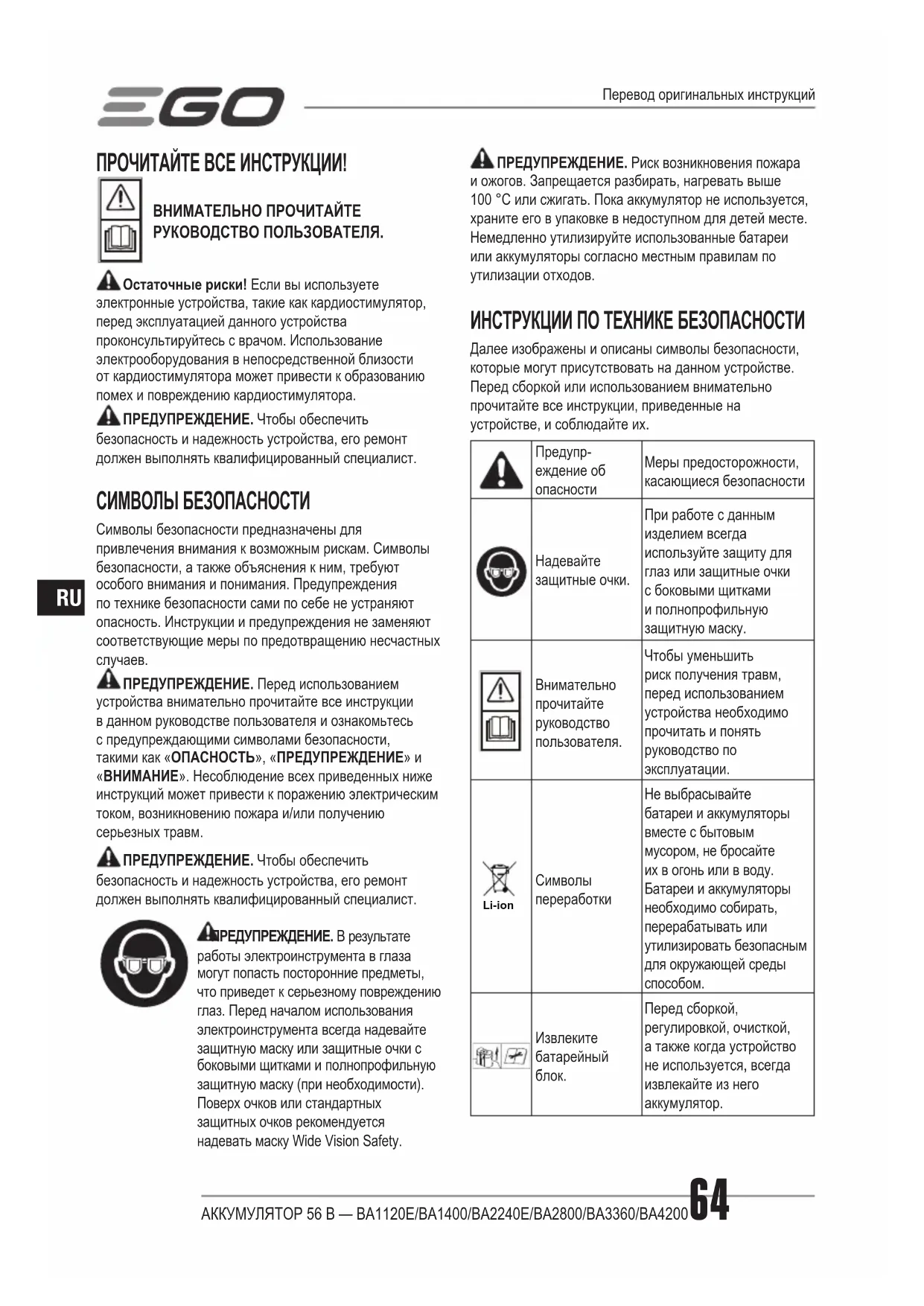 Частота (оборотов в секунду) Ватт Мощность min Минуты ВремяПеременный ток Тип токаПостоянный токТип или характеристика ПРЕДУПРЕЖДЕНИЕ. Внимательно прочитайте все инструкции. Несоблюдение инструкций может привести к поражению электрическим током, возникновению пожара и/или получению серьезных травм. Термин «электроинструмент» во всех приведенных предупреждениях означает работающие от аккумуляторов (беспроводные) садово-огородные устройства EGO Power+. БЕЗОПАСНОСТЬ РАБОЧЕГО МЕСТА ◾ Обеспечьте чистоту и освещенность рабочей зоны. Загроможденные и плохо освещенные места служат причиной несчастных случаев. ◾ Не используйте электроинструменты во взрывоопасных средах, например вблизи горючих жидкостей, газов или пыли. Электроинструменты генерируют искры, которые могут воспламенить пыль или испарения. ЭЛЕКТРОБЕЗОПАСНОСТЬ ◾ Не подвергайте электроинструменты воздействию дождя или влаги. При попадании воды в электроинструмент увеличивается риск поражения электрическим током. ◾ Используйте только зарядные устройства, перечисленные ниже.АККУМУЛЯТОРЫЗАРЯДНОЕ УСТРОЙСТВОBA1120E, BA1400, BA2240E, BA2800, BA3360, BA4200CH5500E, CH2100E ИСПОЛЬЗОВАНИЕ И СОДЕРЖАНИЕ ИНСТРУМЕНТА С ПИТАНИЕМ ОТ БАТАРЕЙ ◾ Заряжайте батареи только с помощью зарядных устройств, указанных изготовителем. Зарядное устройство, предназначенное для одного типа аккумуляторных батарей, может стать причиной пожара при использовании с другим типом батарей. ◾ Используйте электроинструмент только со специально предназначенными для него аккумуляторными батареями. Использование любого другого вида аккумуляторных батарей может стать причиной несчастных случаев или пожара. ◾ Когда аккумулятор не используется, храните его отдельно от металлических предметов — канцелярских скрепок, монет, ключей, гвоздей, винтов и др. — они могут замкнуть контакты. Короткое замыкание контактов аккумуляторной батареи может стать причиной ожогов или пожара. ◾ При неблагоприятных обстоятельствах из батареи может потечь электролит; избегайте контакта с ним. При случайном контакте с кожей промойте пораженный участок проточной водой. Если электролит попал в глаза, обратитесь к врачу. Электролит из батареи может вызвать раздражение и ожоги. ◾ Не разбирайте, не открывайте и не вскрывайте аккумуляторы. ◾ Не подвергайте аккумуляторы воздействию огня или тепла. Не храните в местах попадания прямых солнечных лучей. ◾ Не допускайте короткого замыкания контактов аккумулятора. Не допускайте беспорядочного хранения аккумуляторов в коробке или ящике, где может произойти короткое замыкание между несколькими аккумуляторами или между аккумулятором и другими металлическими предметами.АККУМУЛЯТОР 56 В — BA1120E/BA1400/BA2240E/BA2800/BA3360/BA420066