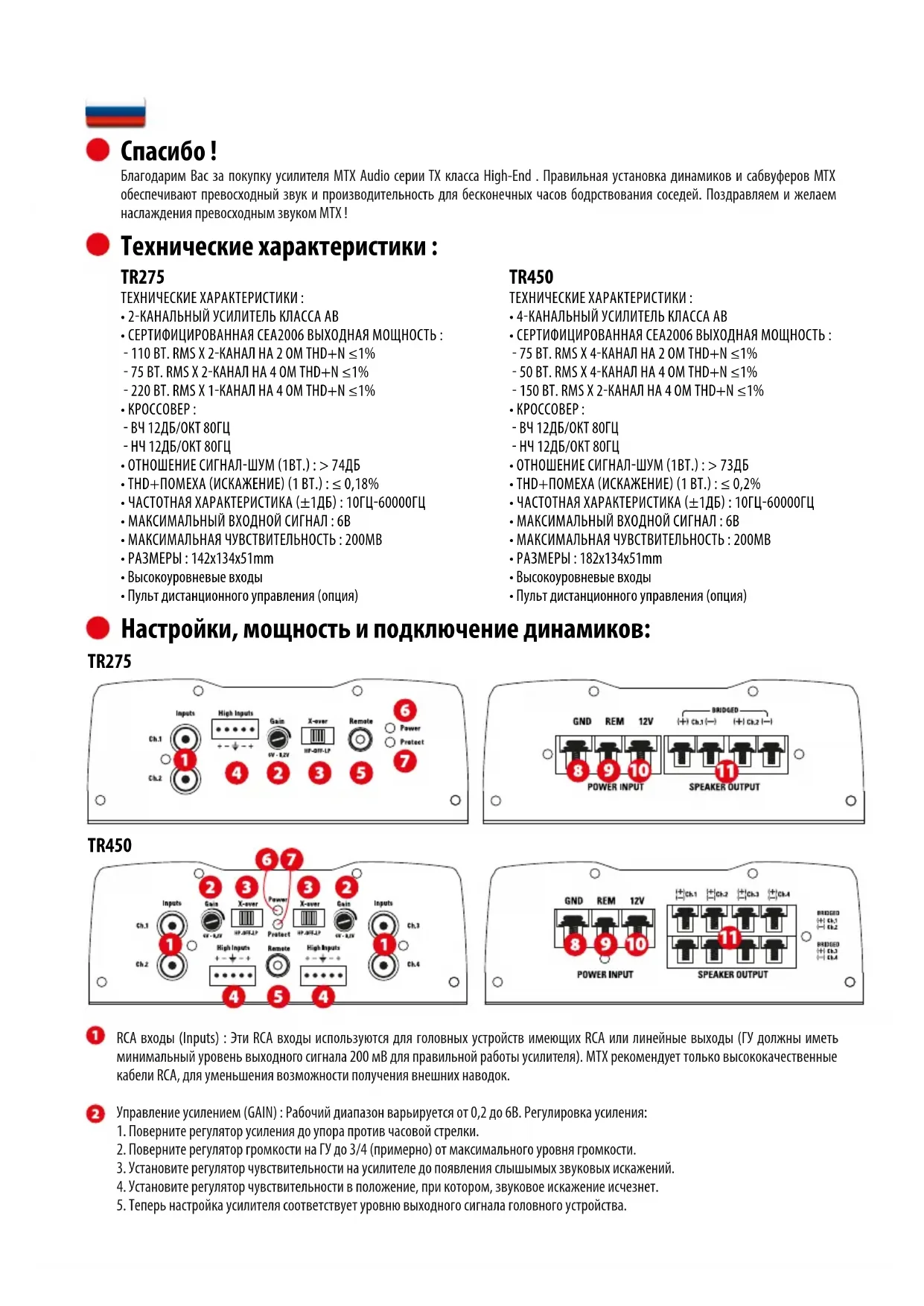 - Пульт дистанционного управления (опция) TR275 TR275 TR450 TR450 RCA входы (Inputs) : Эти RCA входы используются для головных устройств имеющих RCA или линейные выходы (ГУ должны иметь минимальный уровень выходного сигнала 200 мВ для правильной работы усилителя). МТХ рекомендует только высококачественные кабели RCA, для уменьшения возможности получения внешних наводок. Управление усилением (GAIN) : Рабочий диапазон варьируется от 0,2 до 6В. Регулировка усиления: