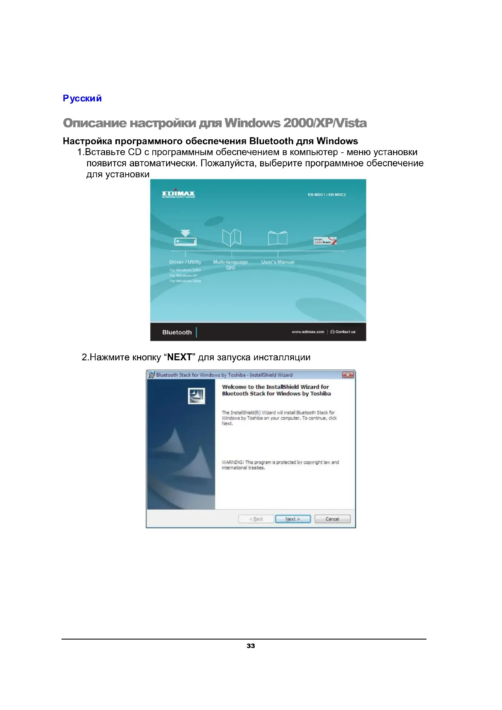Описание настройки для Windows 2000/XP/Vista Настройка программного обеспечения Bluetooth для Windows 1.Вставьте CD с программным обеспечением в компьютер - меню установки появится автоматически. Пожалуйста, выберите программное обеспечение для установки