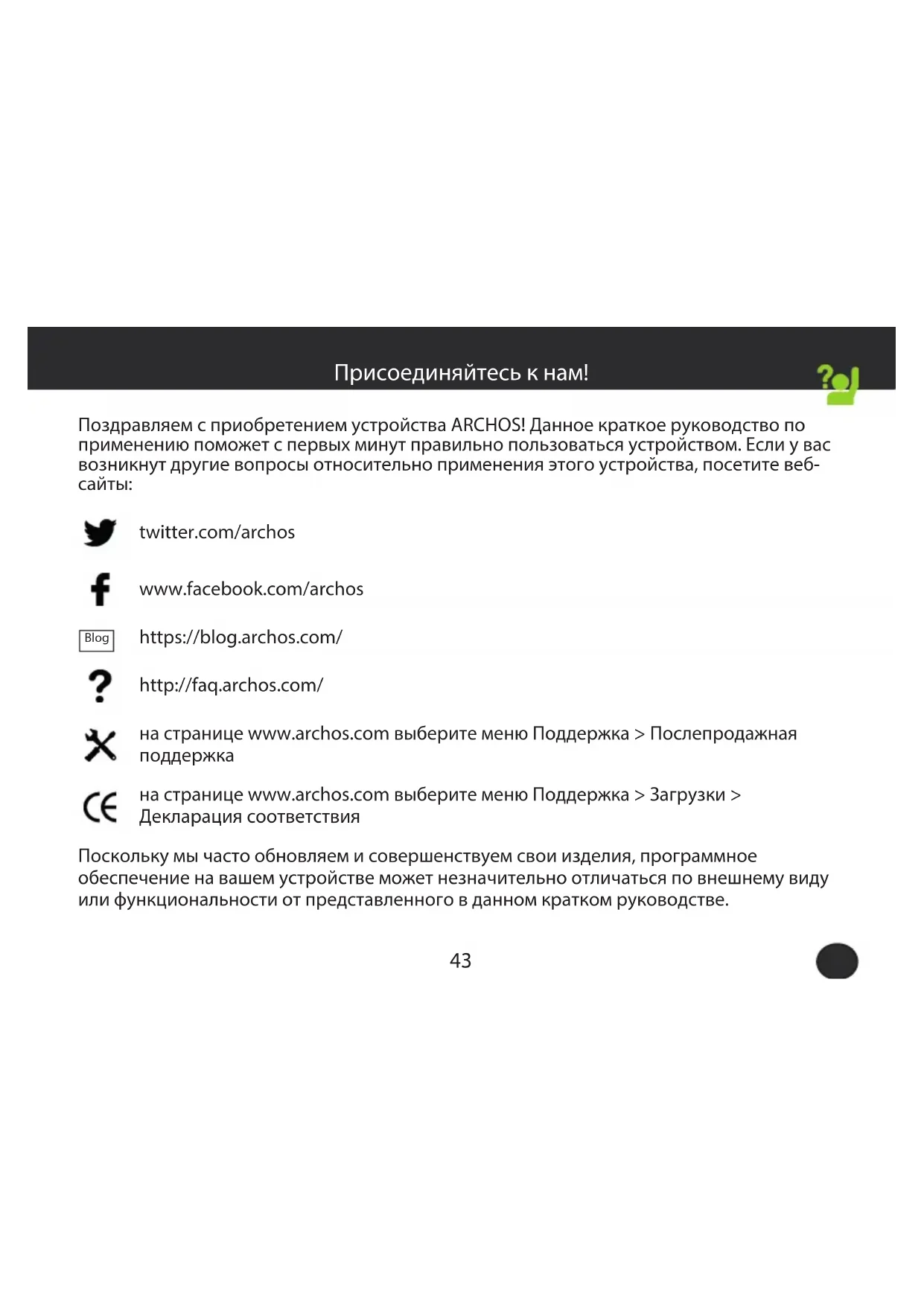 на странице www.archos.com выберите меню Поддержка > Загрузки > Декларация соответствия Поскольку мы часто обновляем и совершенствуем свои изделия, программное обеспечение на вашем устройстве может незначительно отличаться по внешнему виду или функциональности от представленного в данном кратком руководстве. Присоединяйтесь к нам!44 Warranty