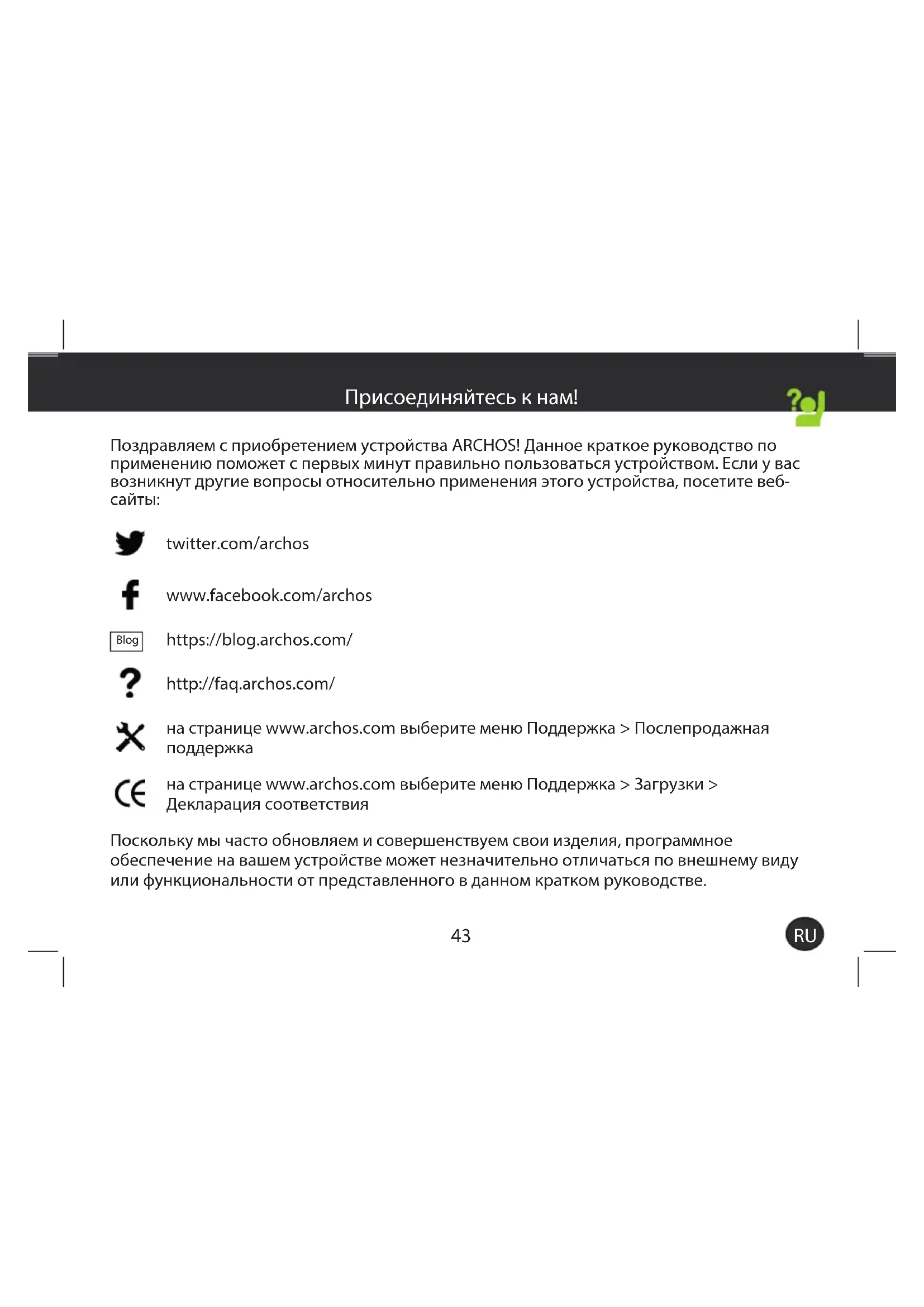 twitter.com/archos www.facebook.com/archos Blog https://blog.archos.com/ http://faq.archos.com/ на странице www.archos.com выберите меню Поддержка > Послепродажная