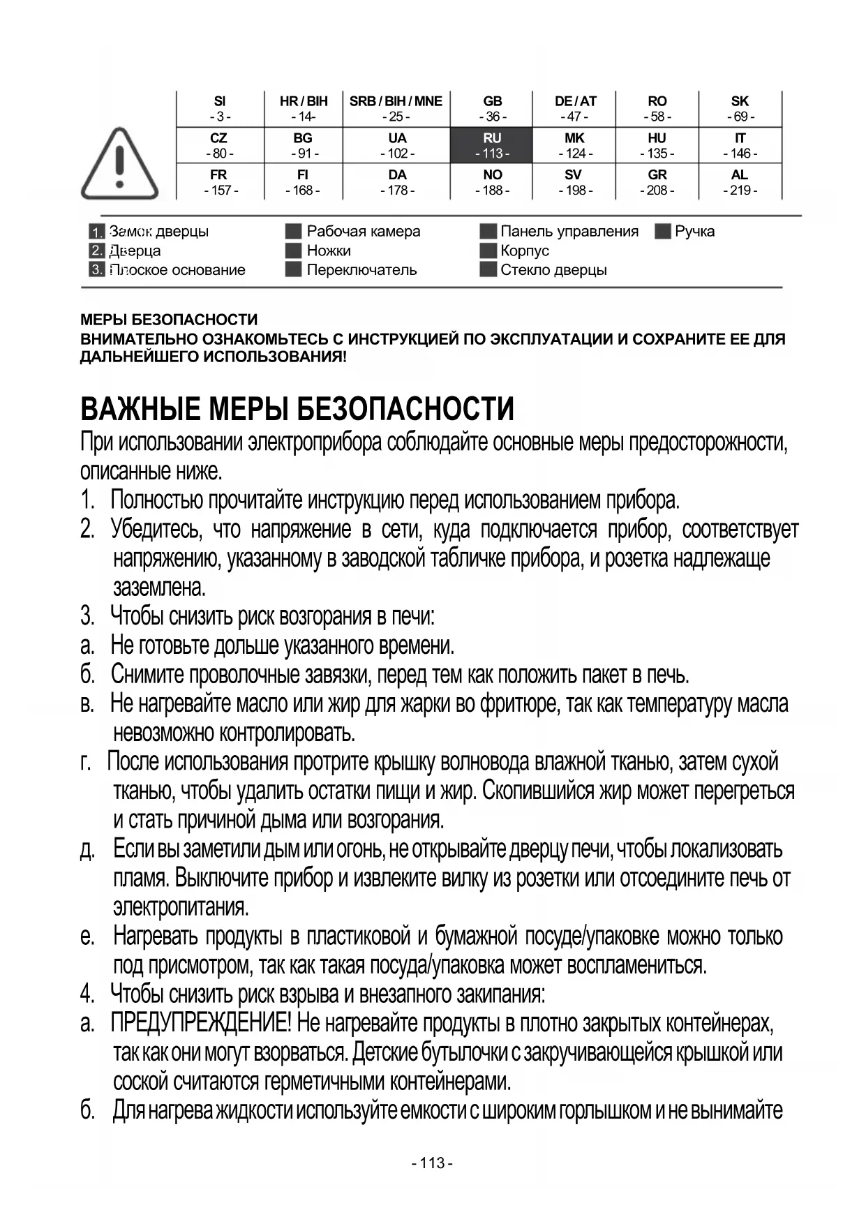 повреждений, таких как: а. сильные повреждения корпуса, б. поврежденная дверца и переключатель, в. поврежденная металлическая сетка дверцы, г. плохо закрепленный шнур питания. Если присутствует хотя бы одно из указанных повреждений, обратитесь в магазин, где вы приобрели прибор, или в сервисный центр.