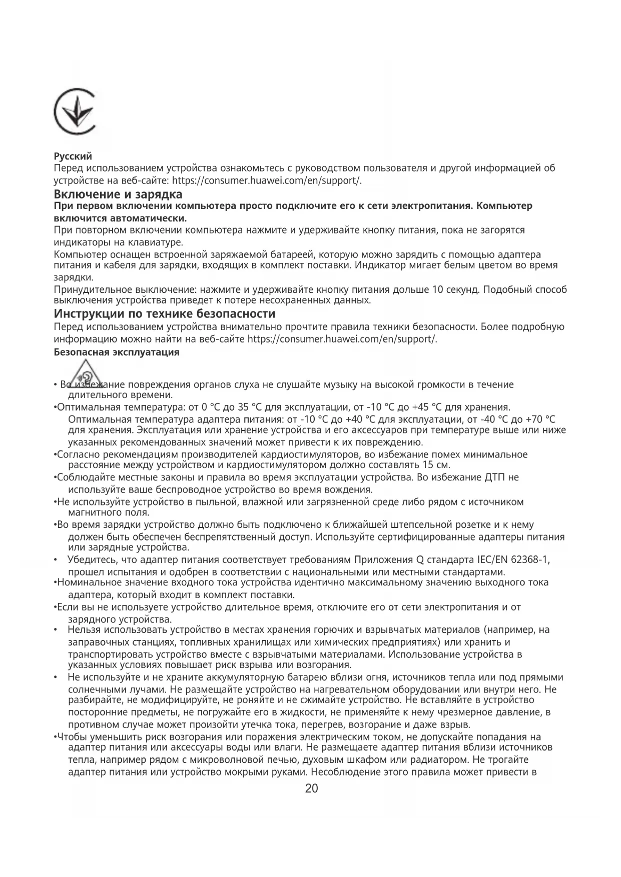 СПРОЩЕНА ДЕКЛАРАЦІЯ про відповідність Справжнім Huawei Device Co., Ltd. заявляє, що тип радіообладнання CREF-X відповідає Технічному регламенту радіообладнання; Повний текст декларації про відповідність доступний на веб-сайті за такою адресою: https://consumer.huawei.com/certication. 19Русский Перед использованием устройства ознакомьтесь с руководством пользователя и другой информацией об устройстве на веб-сайте: https://consumer.huawei.com/en/support/. Включение и зарядка При первом включении компьютера просто подключите его к сети электропитания. Компьютер включится автоматически. При повторном включении компьютера нажмите и удерживайте кнопку питания, пока не загорятся индикаторы на клавиатуре. Компьютер оснащен встроенной заряжаемой батареей, которую можно зарядить с помощью адаптера питания и кабеля для зарядки, входящих в комплект поставки. Индикатор мигает белым цветом во время
