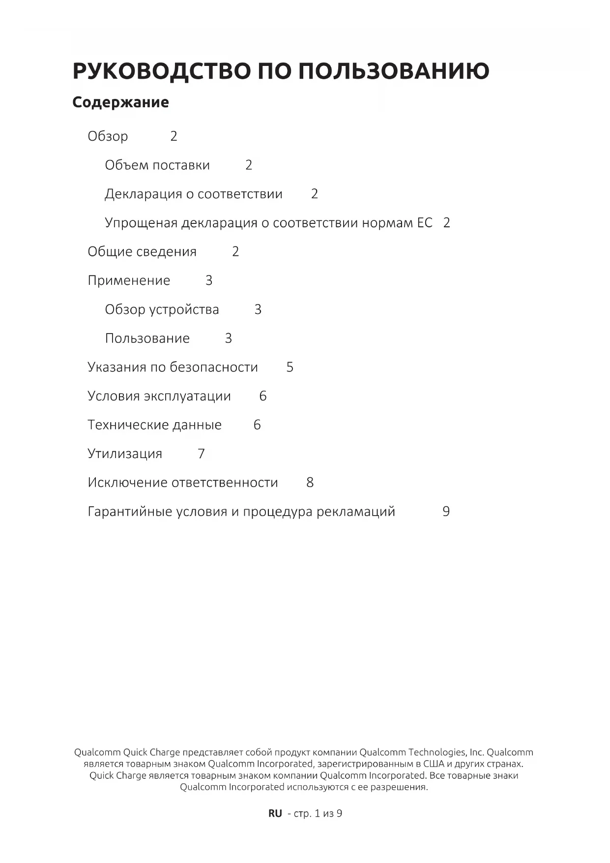 Oбзор 2 Объем поставки 2 Декларация о соответствии 2 Упрощеная декларация о соответствии нормам ЕС 2 Общие сведения 2 Применение 3 Обзор устройства 3 Пользование 3 Указания по безопасности 5 Условия эксплуатации 6 Технические данные 6 Утилизация 7 Исключение ответственности 8 Гарантийные условия и процедура рекламаций 9 Qualcomm Quick Charge представляет собой продукт компании Qualcomm Technologies, Inc. Qualcomm является товарным знаком Qualcomm Incorporated, зарегистрированным в США и других странах. Quick Charge является товарным знаком компании Qualcomm Incorporated. Все товарные знаки Qualcomm Incorporated используются с ее разрешения.RU - стр. 2 из 9