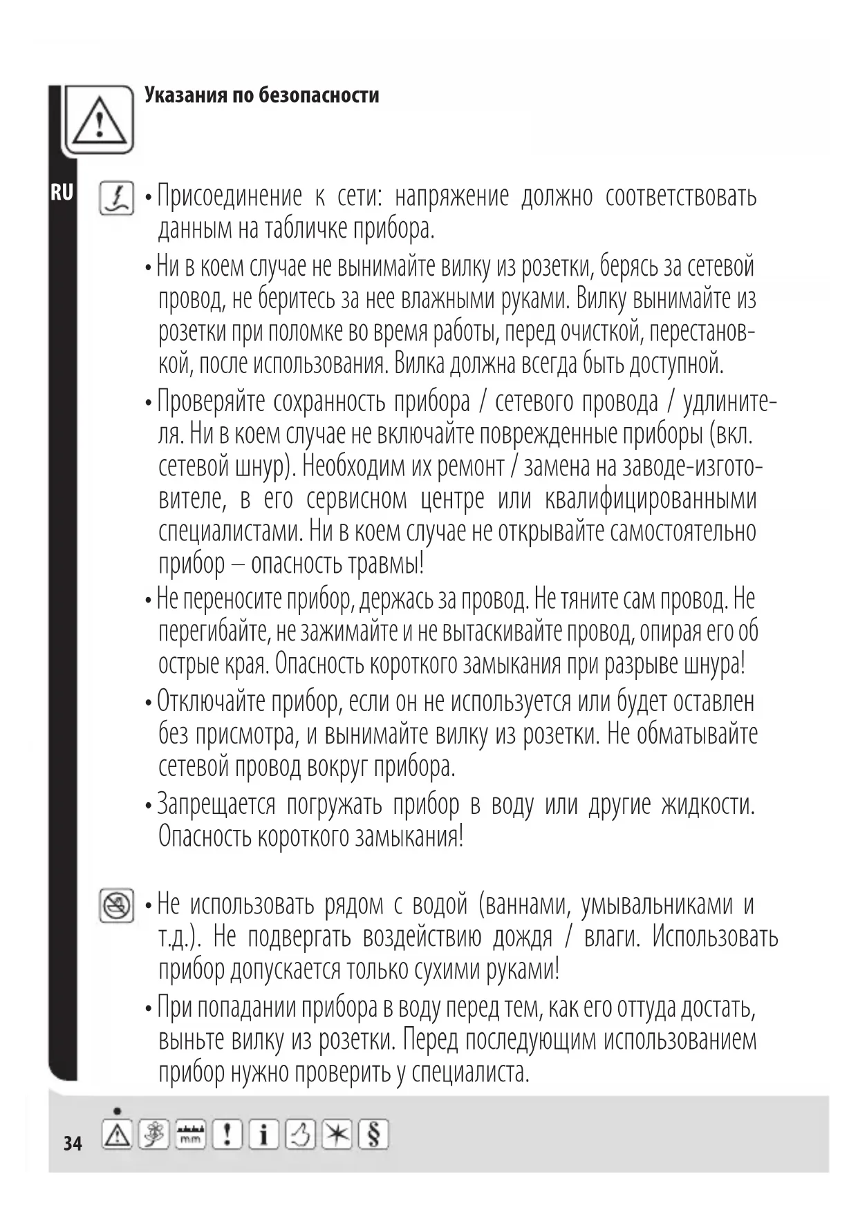 - Не использовать рядом с водой (ваннами, умывальниками и т.д.). Не подвергать воздействию дождя / влаги. Использовать прибор допускается только сухими руками!35 Указания по безопасности