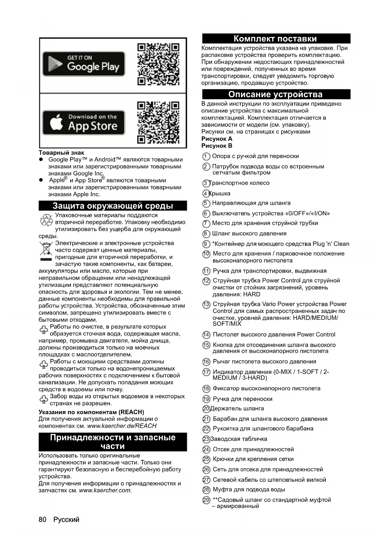Использовать только оригинальные принадлежности и запасные части. Только они гарантируют безопасную и бесперебойную работу устройства. Для получения информации о принадлежностях и запчастях см. www.kaercher.com. Комплект поставки Комплектация устройства указана на упаковке. При распаковке устройства проверить комплектацию. При обнаружении недостающих принадлежностей или повреждений, полученных во время транспортировки, следует уведомить торговую организацию, продавшую устройство. Описание устройства В данной инструкции по эксплуатации приведено описание устройства с максимальной комплектацией. Комплектация отличается в зависимости от модели (см. упаковку). Рисунки см. на страницах с рисунками Рисунок A Рисунок B 1 Опора с ручкой для переноски 2 Патрубок подвода воды со встроенным сетчатым фильтром 3 Транспортное колесо 4 Крышка 5 Направляющая для шланга 6 Выключатель устройства «0/OFF»/«I/ON» 7 Место для хранения струйной трубки 8 Шланг высокого давления 9 *Контейнер для моющего средства Plug 'n' Clean 10 Место для хранения / парковочное положение высоконапорного пистолета 11 Ручка для транспортировки, выдвижная 12 Струйная трубка Power Control для струйной очистки от стойких загрязнений, уровень давления: HARD 13 Струйная трубка Vario Power устройства Power Control для самых распространенных задач по очистке, уровней давления: HARD/MEDIUM/ SOFT/MIX 14 Пистолет высокого давления Power Control 15 Кнопка для отсоединения шланга высокого давления от высоконапорного пистолета 16 Рычаг пистолета высокого давления 17 Индикатор давления (0-MIX / 1-SOFT / 2- MEDIUM / 3-HARD) 18 Фиксатор высоконапорного пистолета 19 Ручка для переноски 20 Держатель шланга 21 Барабан для шланга высокого давления 22 Рукоятка для шлангового барабана 23 Заводская табличка 24 Отсек для принадлежностей 25 Крючки для крепления сетки 26 Сеть для отсека для принадлежностей 27 Сетевой кабель со штепсельной вилкой 28 Муфта для подвода воды 29 **Садовый шланг со стандартной муфтой – армированныйРусский 81 – минимальный диаметр 1/2 дюйма (13 мм) – минимальная длина 7,5 м 30 **Всасывающий шланг KÄRCHER для подачи воды из открытых емкостей (№ для заказа 2.643- 100.0) 31 Винты и дюбели, входящие в комплект поставки 32 *Пенная насадка с контейнером для моющего