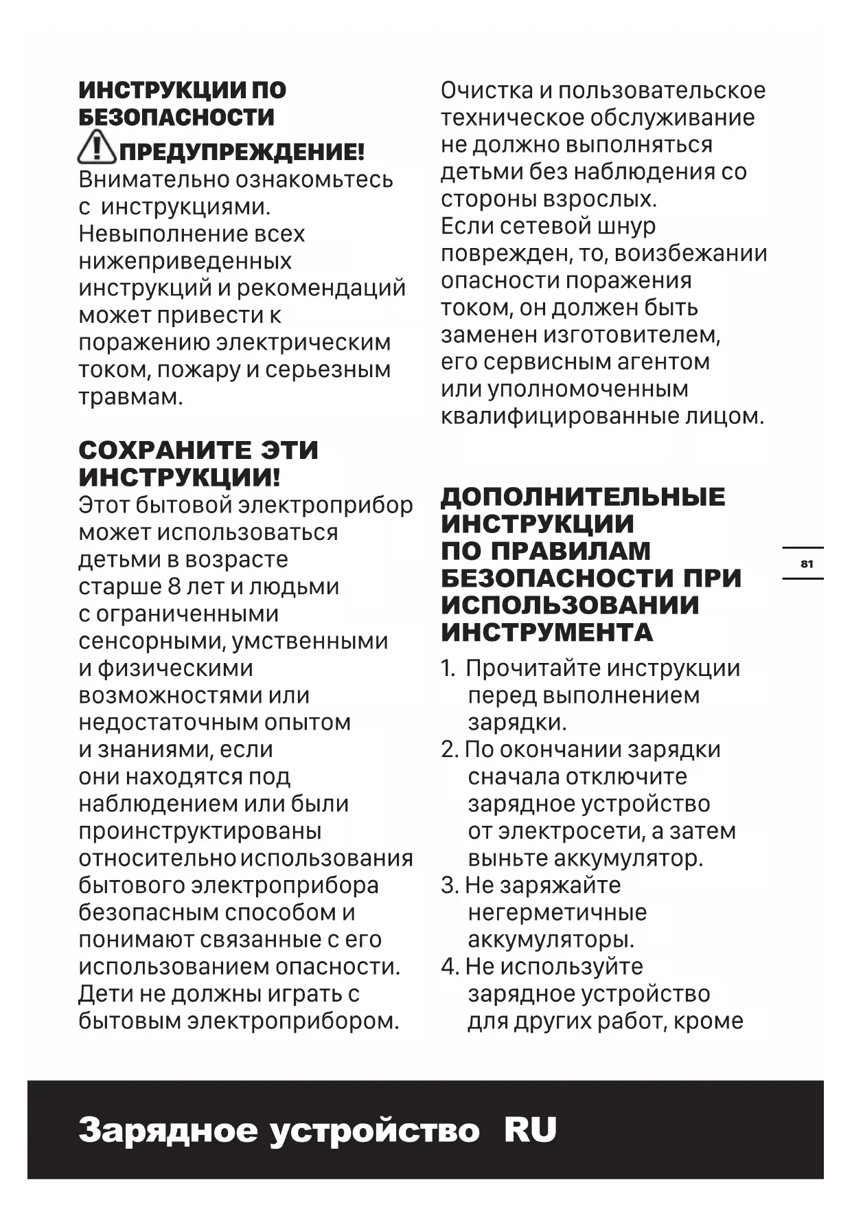 14.При зарядке akкулаяtopа убениесь,чTo 3apядhoe yстpoистBO haxODNTСВ Xорошо проветривaelOM MeCTe И ВдалИ OT Лergobocпламеняюшихся пpeДmetOB.AKKumлаяТOPbl MOryT HaRpeBaTbcrB IIpoцecse 3apяdkn..He OCTabлиTe 6e3ПрисмOTpa akkuулаяТОИЗapядhoe yстpoистBO BO BpeMЯ 3apяdkn.