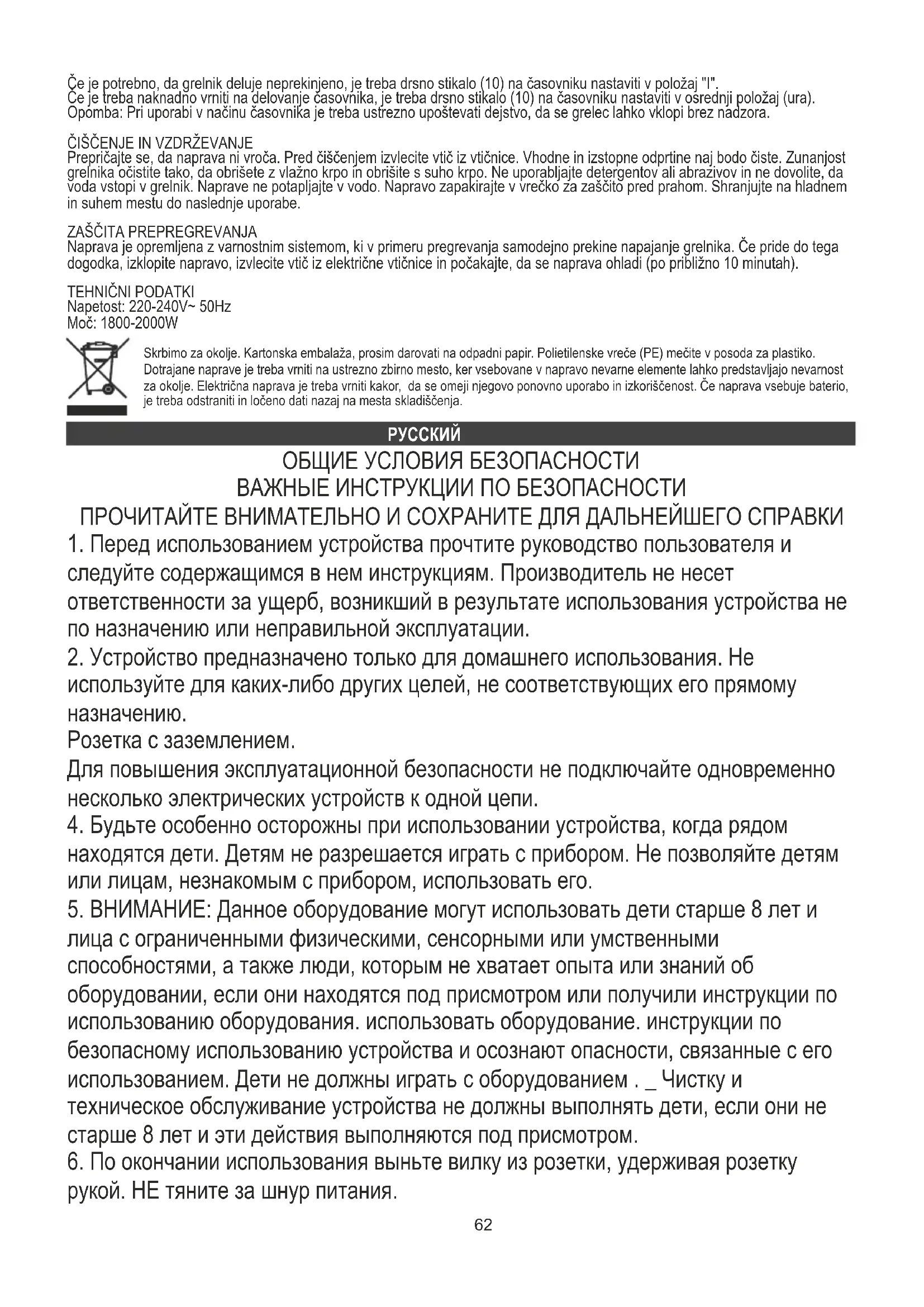 лица с ограниченными физическими, сенсорными или умственными способностями, а также люди, которым не хватает опыта или знаний об оборудовании, если они находятся под присмотром или получили инструкции по использованию оборудования. использовать оборудование. инструкции по безопасному использованию устройства и осознают опасности, связанные с его использованием. Дети не должны играть с оборудованием . _ Чистку и техническое обслуживание устройства не должны выполнять дети, если они не старше 8 лет и эти действия выполняются под присмотром.