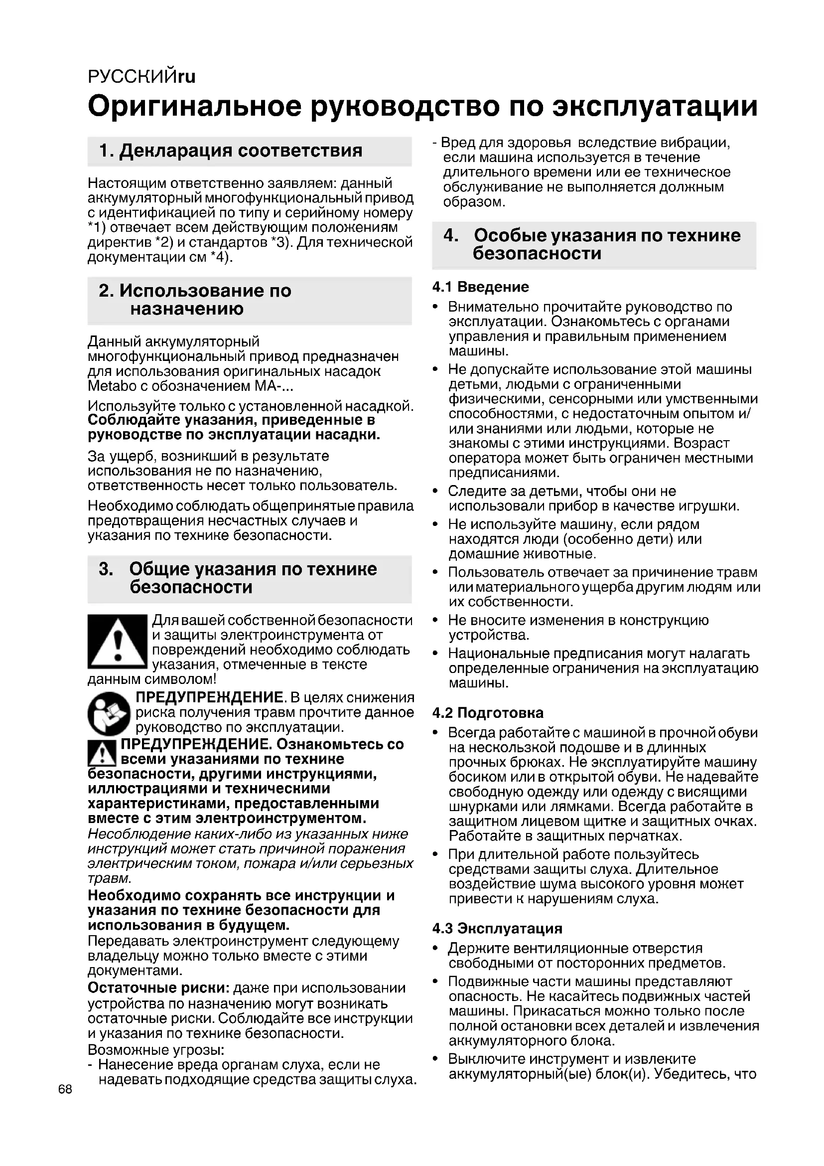 Оригинальное руководство по эксплуатации Настоящим ответственно заявляем: данный аккумуляторный многофункциональный привод с идентификацией по типу и серийному номеру *1) отвечает всем действующим положениям директив *2) и стандартов *3). Для технической документации см *4). Данный аккумуляторный многофункциональный привод предназначен для использования оригинальных насадок Metabo с обозначением MA-... Используйте только с установленной насадкой. Соблюдайте указания, приведенные в руководстве по эксплуатации насадки.