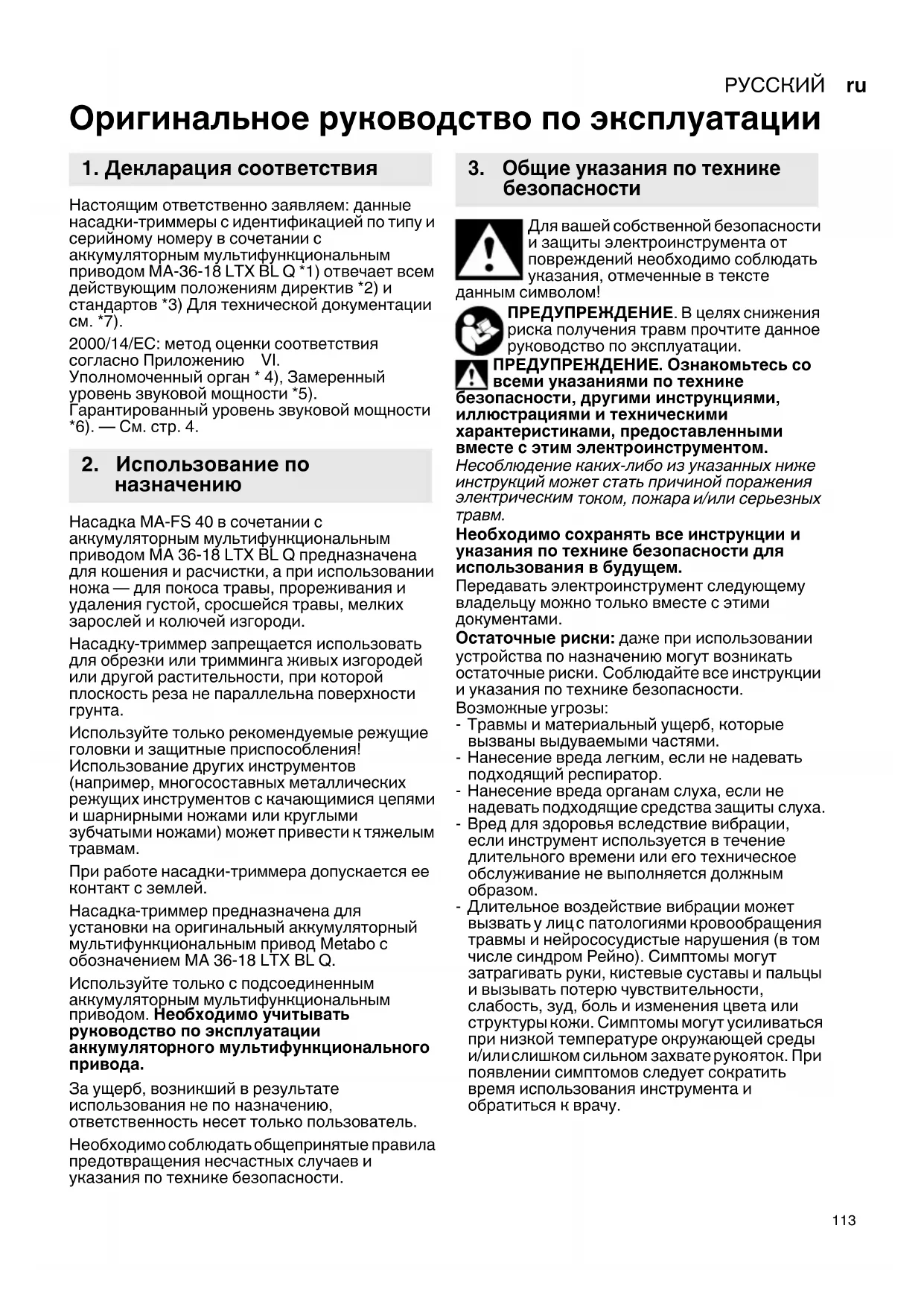 Оригинальное руководство по эксплуатации Настоящим ответственно заявляем: данные насадки-триммеры с идентификацией по типу и серийному номеру в сочетании с аккумуляторным мультифункциональным приводом MA-36-18 LTX BL Q *1) отвечает всем действующим положениям директив *2) и стандартов *3) Для технической документации см. *7). 2000/14/EС: метод оценки соответствия согласно Приложению VI. Уполномоченный орган * 4), Замеренный уровень звуковой мощности *5). Гарантированный уровень звуковой мощности *6). — См. стр. 4. Насадка MA-FS 40 в сочетании с аккумуляторным мультифункциональным приводом MA 36-18 LTX BL Q предназначена для кошения и расчистки, а при использовании ножа — для покоса травы, прореживания и удаления густой, сросшейся травы, мелких зарослей и колючей изгороди. Насадку-триммер запрещается использовать для обрезки или тримминга живых изгородей или другой растительности, при которой плоскость реза не параллельна поверхности