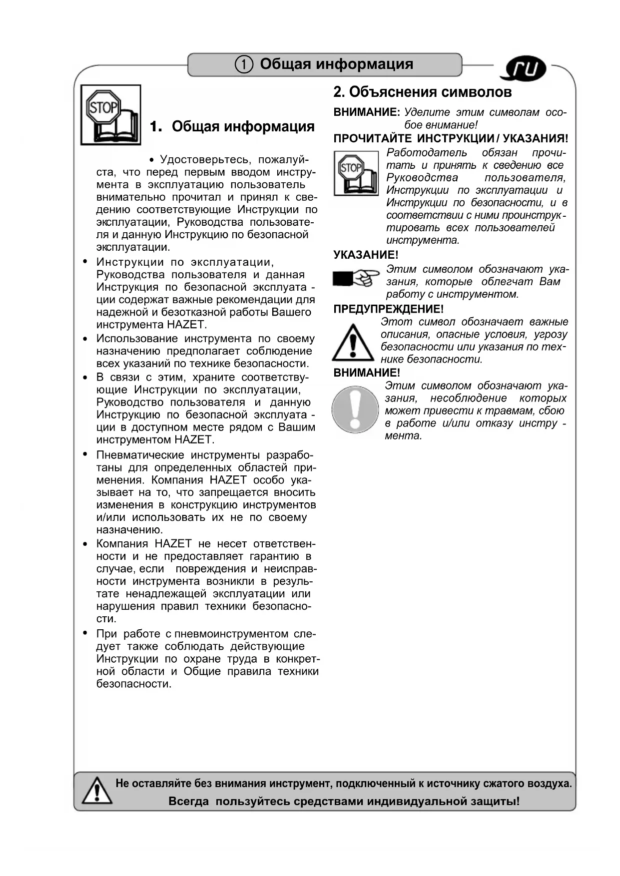 ВНИМАНИЕ: Уделите этим символам осо- бое внимание! ПРОЧИТАЙТЕ ИНСТРУКЦИИ / УКАЗАНИЯ! Работодатель обязан прочи- тать и принять к сведению все Руководства пользователя, Инструкции по эксплуатации и Инструкции по безопасности, и в соответствии с ними проинструк